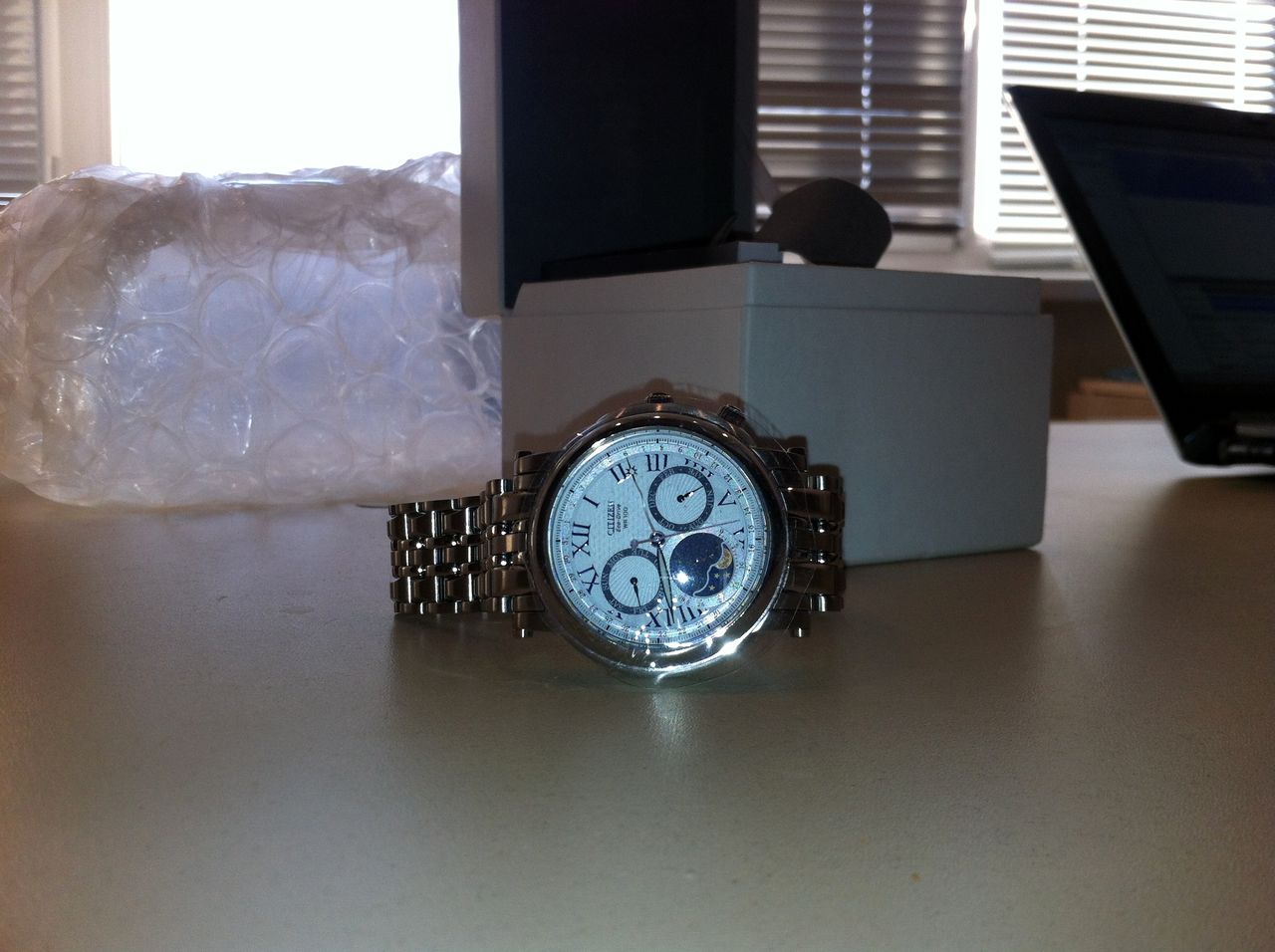 Сегодня получил на почте Citizen Men ECO-DRIVE Moon Phase AP1011-58A. 07 мая посылка была отправлена. 29 мая прибыла в Самару. Хорошая упаковка. Пупырчатая пленка и картонная коробка. На упаковке не сэкономили, молодцы. Часы пришли в пленке. Открыв коробку с часами, обнаружил, что часы стоят. Задвинув одну из головок, они ожили, и начали свой, надеюсь, бесконечный бег. Качество обработки браслета и корпуса очень хорошее, ничуть не хуже, Complication BU0011-55, который тоже имеется. На 4-х часах – указатель месяца. На 9-ти часах – указатель дня недели. На 7-ми часах – указатель фазы луны. Тонкая стрелка, со звездой на конце, указывающая текущее число, установлена вместе с часовой, минутной и секундной на одну ось. Проблем с читаемостью никаких. Минутная и часовая стрелки покрыты флуоресцентным составом. В коробке заполненный гарантийный талон на 3 года. Спасибо Capt Cook за помощь в покупке. Ссори за фото. Не фотограф я, да и под рукой только Iphone. Фото на руке нет, т.к. откровенно не получились. Но, обещаю, будут. Вложение 264293 Вложение 264294 Вложение 264295 Вложение 264296 Вложение 264297 Вложение 264298 Вложение 264299 |
