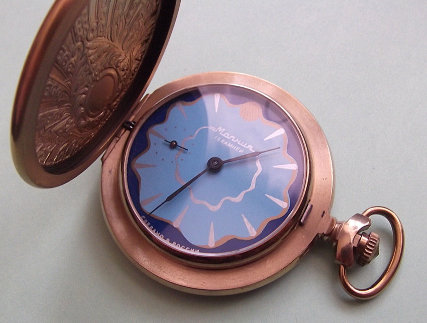 Вот еще такая молния. Чего на крышке хрен поймешь, репа какая-то. Циферблат тоже странный. Задняя крышка - узор.