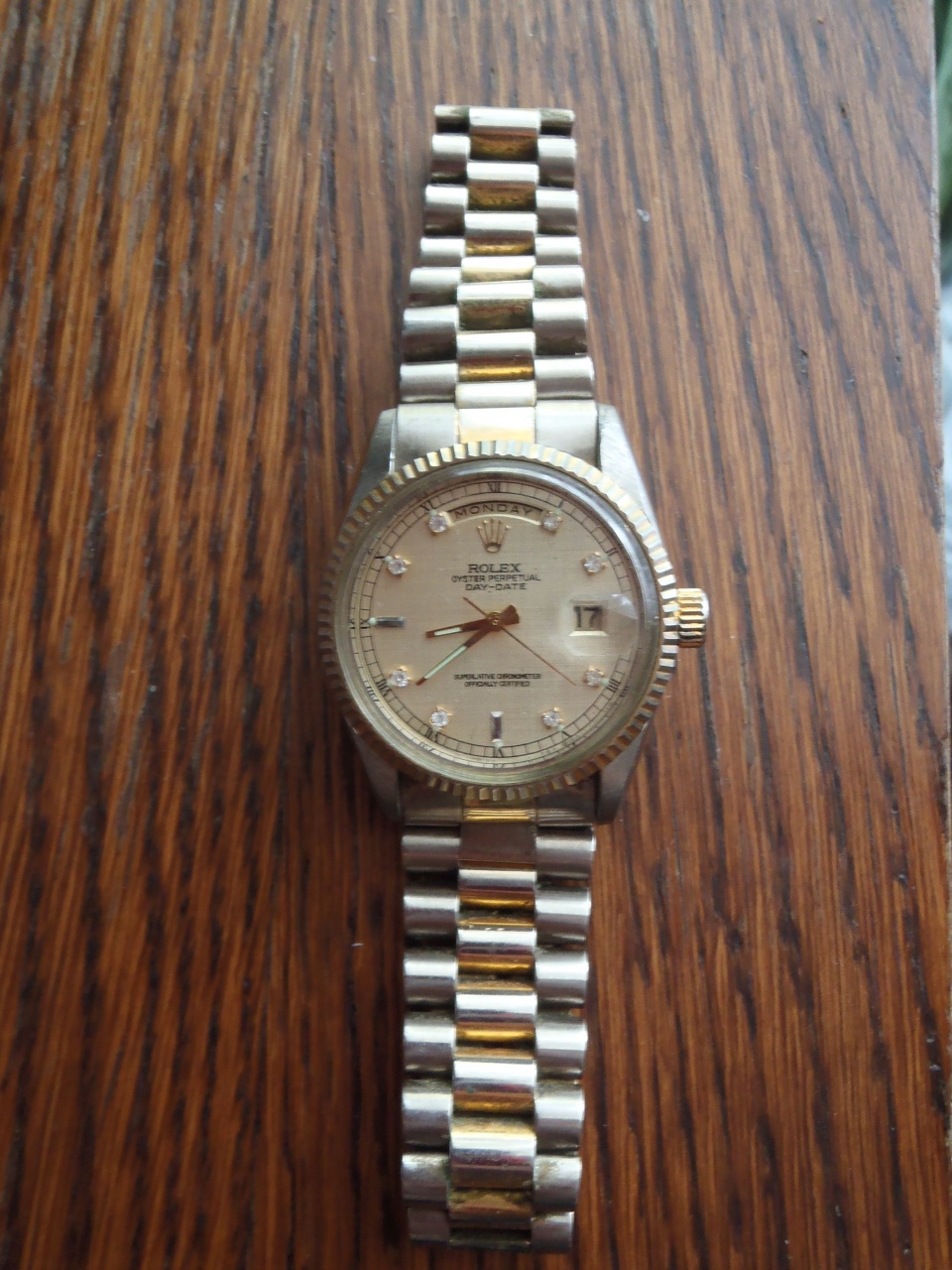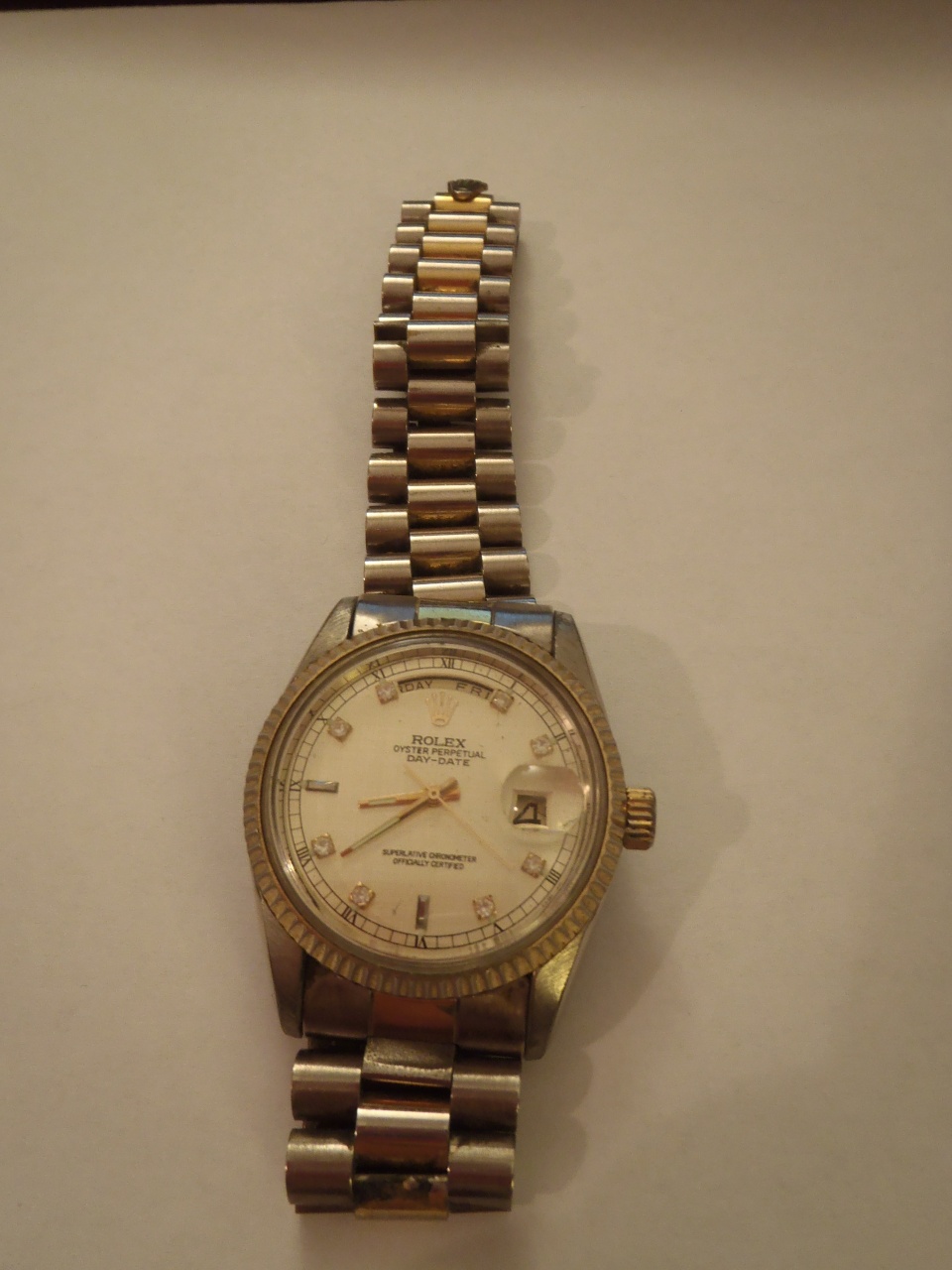 На днях в шкафу откопал старые дедушкины часы. К сожалению, его давно нет, и от своих домашних я тоже не могу получить никакой информации. Я даже не могу понять модель: на лицевой стороне написано oyster perpetual day-date, а на тыльной - ничего. Вопросов несколько: 1. Какое полное название модели и примерный год выпуска (часам абсолютно точно больше 22-х лет) 2. Подскажите мастерскую в Питере, где их можно привести в порядок и отремонтировать, поскольку, к сожалению, они не на ходу 3. Также хотелось бы узнать их стоимость на вскидку (в рабочем и нерабочем состоянии) 4. Стоит ли с ними что-то делать, наверное, мне скажет только мастер, как считаете? Заранее благодарен ответившим Вложение 513005 Вложение 513006 Вложение 513007 Вложение 513008 Вложение 513031 |
