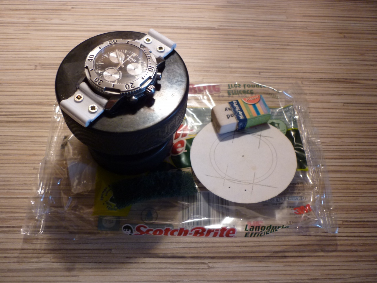 Речь пойдет об одном из вариантов их устранения в домашних условиях. Я положительно неравнодушен к этому виду декора металлических поверхностей - сатинированию, и при выборе часов уделяю этому особое внимание. Благодаря игре света на обработанных по этому методу поверхностях, часы выглядят интереснее и привлекательнее по сравнению с вариантом обычной полировки. Особенно красиво часы выглядят, когда используется комбинация полированных и сатинированных поверхностей. Однако, есть обратная сторона медали этой красоты – любая царапина на такой поверхности сразу заметна и бросается в глаза. А восстановление затруднительно – нужно нести в мастерскую, хороших мастеров мало и т.д. Кроме того, не нести же часы в мастерскую из-за одной маленькой царапки. Но ее наличие раздражает и настроение портит. В свое время по неосторожности поставил такую мелкую царапку на ранте часов. И задумался над тем как бы ее убрать. Просто заполировать – не вариант. Поверхность сатинированная, но сложность еще и в том, что направление вдоль ранта, т.е. по окружности. Тут как ни старайся все равно будет заметно. Для того, чтобы царапку "по-правильному" убрать и не попрощаться с "сатином" нужно часы как-то закрепить на чём-то вращающемся – т.е., чтобы "бороздки" образовывали собой концентрические круги. Задачка еще та... Думал-думал, на этих выходных решил попробовать. В качестве платформы для крепежа часов использовал простую хоккейную шайбу. Хорошо бы конечно сделать некий унифиированный девайс – хотел даже блендер под это дело использовать. Но там такие люфты, как эту шайбу закрепить непонятно, да и обороты нужно значительно уменьшать... В итоге, не мудрствуя лукаво, решил использовать простую электродрель, предварительно зафиксированную в тисках. Кстати, отдельно приобрел тиски для это дела – удобная штука – благодаря шарнирному соединению можно регулировать угол поворота в обеих плоскостях. В частности, благодаря этому оказалось возможным закрепить дрель вертикально. В качестве абразива использована губка для мытья посуды Scotch Brite – где-то на форуме читал, что вроде как применение дает неплохой результат. Вот и попробуем, ). Побывать в роли "подопытных" вызвались Tissot PRS 200 – так и сказали, мол, мы у тебя давно и неплохо было бы полированный безель сделать сатинированным, мы готовы, ). Ну что же, после мучений с разметкой (пригодилась готовальня со штангенциркулями) и сверлением центрального отверстия часы оказались закреплены на "платформе". http://forum.watch.ru/attachment.php...9&d=1397327122 В качестве "крепежных ограничителей" удачно подошли мебельные ножки от кухонного гарнитура (очень кстати там внутренние продольные прорези). Их пришлось обрезать по бокам до ширины 20 мм и выточить срединки - упирались в корпус часов и прорези не доставали до штифтов на часах. Итак, теперь добро пожаловать в патрон дрели! Страшновато – вдруг испорчу? Но, что делать – не останавливаться же не пол-пути... Конструкция закреплена, сделан пробный старт – есть незначительное "биение" при вращении, но в целом приемлемо. Теперь – сам процесс. Из губки вырезан небольшой сегмент и отделена мягкая желтая часть. Сам зеленый кусочек желательно смочить водой, чтобы он размягчился (чтобы волокна стали мягче и уплотнились) – для более равномерного соприкосновения с поверхностью металла. Одна минута и – ре