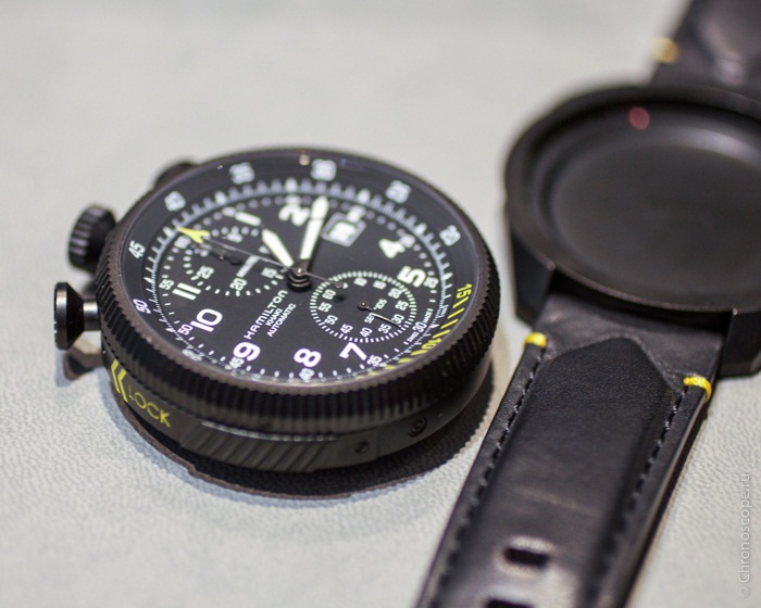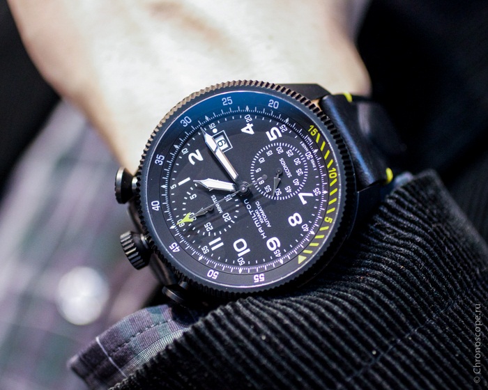 Khaki Takeoff — это часы двойного назначения: они могут быть как настольными, так и наручными. Их продают в подарочной коробке, которая стилизована под приборную панель самолета. Хронограф установлен в центре панели — он ввинчен в специальное гнездо с названием модели. Если же владелец захочет надеть часы на руку, то ему надо будет вывернуть корпус из панели и пересадить «шайбу» на ремешок с креплением для нее. Корупс сделан из стали с черным PVD-покрытием. Его диаметр составляет 46,3 мм. Khaki Takeoff — это буллхед, кнопки хронографа и массивная заводная головка находятся у отметки «12 часов», а не на «3 часах» как обычно. Безель декорирован рифлением. Он вращается в две стороны и используется для управления внутренней шкалой обратного отсчета. Шкала получила яркую желтую расцветку — в тон наконечнику стрелки хронографа и прострочке ремешка. Индексы сделаным белыми и отлично читаются на черном циферблате. Они покрыты люминесцентным составом. В часах установлен автоматический механизм H-31 с 60-часовым запасом хода. Этот калибр создан ETA специально для нужд Hamilton и активно используется в других сериях. Модель выпущена сравнительно небольшим тиражом в 1999 экзепмляров (каждые часы пронумерованы). Цена: $ 3295. Вложение 730054Вложение 730055Вложение 730056Вложение 730057 Источник: http://chronoscope.ru/2014/06/hamilt...f-auto-chrono/ |