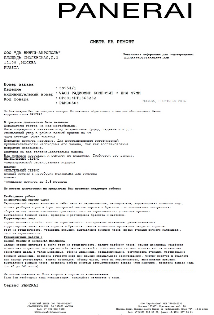 Ремонт часов Panerai в сервисе Richemont на Столешниковом