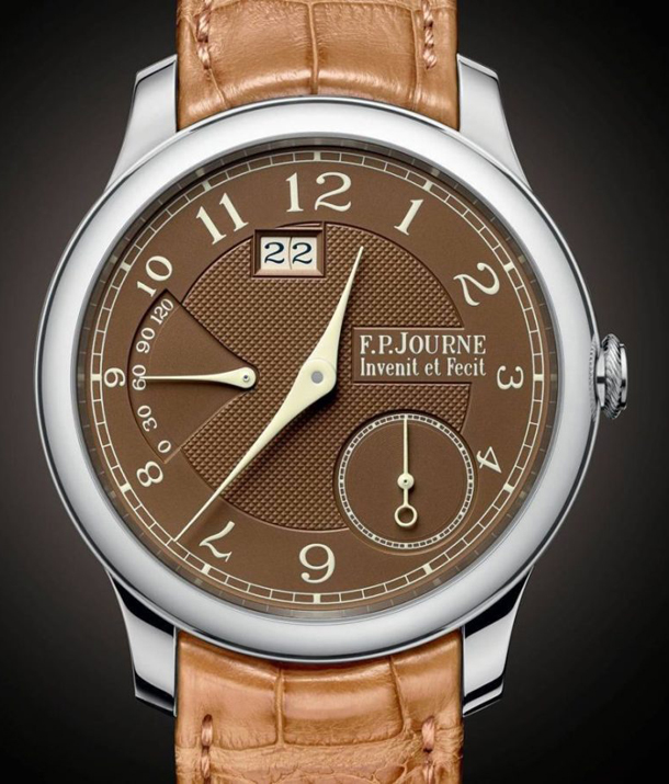 Мануфактура F.P. Journe презентовала новинку в рамках коллекции Octa Automatique Reserve, которая стала настоящим хитом среди поклонников бренда. В платиновый корпус диаметром 40 мм заключен коричневый циферблат “Havana”. Часы комплектуются ремешком из кожи аллигатора карамельного цвета с платиновой застежкой. Циферблат отделан в лучших традициях Journe – гильоширование Clous de Paris, арабские цифры и минутная шкала в виде железнодорожного полотна на периферии.
