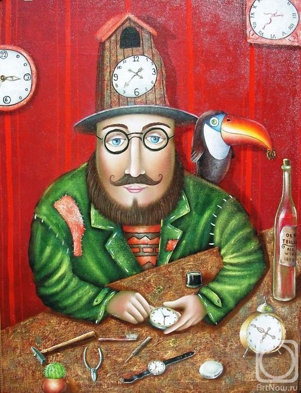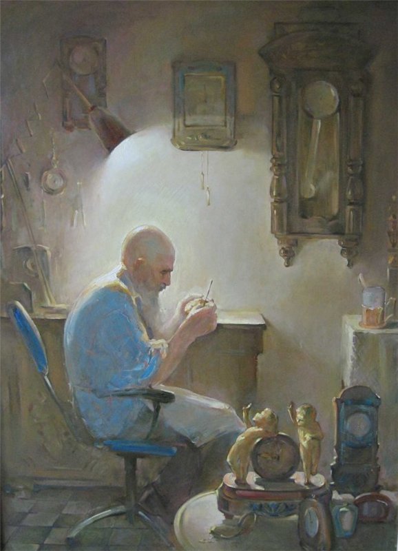 Часовщик Устал часовщик, исковерканы возрастом пальцы. Разбиты часы, заржавели души шестерёнки. Убей его, доктор, оно не желает сдаваться - Упрямое время с кривой циферблатной каёмкой. Песочит виски и гофрирует тонкую кожу, Стирает из памяти лица, и числа, и даты... Убей его, мастер, а после вернётся, быть может, Пропащая молодость с ровной каймой циферблата. Твой таймер устал кукарекать, не надо фантазий... Всё сломано, видишь? Ответит стареющий гений: «Ты, время, не деньги - но тоже тебя не хватает»... Жаль в новых часах не найдется иных измерений. Виктория Дворецкая Вложение 123904 Charles Spencelayh Time on his hands. Часовщик — профессия, ранее ремесленническая специализация. Мастер по изготовлению и ремонту настенных, наручных и прочих часов. Также «часовщиками» (разг.) называют людей, профессионально занимающихся часами, работающих в сфере часового бизнеса (производителей часов, владельцев часовых магазинов, часовых дизайнеров и т.д.). Википедия Вложение 123905 Гравюра И. Аммана Часовщик. Вложение 123906 Gabriel Jacques de Saint-Aubin Portrait of a Clockmaker 1767 г. Вложение 123907 Jefferson David Chalfant The Clock Maker. 1900 г. Вложение 123908 James Campbell Our Village Clockmaker Solving A Problem. Часовщик Наша честная тайна проста: время выдули и остудили, поднесли к шестеренке уста и дыханьем металл освятили. Раньше были пружины мертвы – тут воспрянули, затрепетали. Время, что калибрует миры, поселилось в поющем металле. Но настала другая пора – нет нужды в нашей тонкой работе. Табуреточных дел мастера всех усердней в проворной щедроте. Боже мой! Этот царственный пот, эта скорость и эта сноровка. Каждый – воин, игрок, патриот, даже в чем-то – под нас маскировка. Нам бы верная ваша муштра! Мы – ворье, мы – незваные гости. В деревянную плоть мастера не устанут вколачивать гвозди. Слишком схожи тик-так и тук-тук, и никто не заметил подмены. Не вернуть околдованный звук в наши полные горечью вены. Я один из последних, сынок. После нас лишь одни табуретки. Будь, как зимний цветок, одинок, но хитрее и проще, чем предки. Мы цепляемся каждой строкой за слепые свои шестеренки, но уходим. Пускай в мастерской сочиняют о нас побасенки. Евгений Никитин Вложение 123909 Charles Spencelayh The Clockmaker Вложение 123910 Charles Spencelayh Puzzled. Вложение 123911 Charles Spencelayh The Old Clockmaker. Вложение 123912 Charles Spencelayh The Clock. Часовщик Я - часовщик упавшей серой башни, Вокруг лишь звёздная труха. Со временем две стрелки крутят шашни И режут флюгер-петуха. На тень моих шевронных шестерёнок Толпа не крестится вночи, К закату солнце свёклою варёной Опять презрительно молчит. Я - часовщик и время - мой правитель С дурацкой шапкой из кота, Он - сюзерен пиров и чаепитий, Он жрёт секунды и года. Но кровь не вытрет даже Мистер Пропер В часах с кукушкой и совой, Мне медленно ломают кости рёбер Чугунной стрелкой часовой. Евгений Пивень Вложение 123913 Юрий Пэн Часовщик 1914 г. Вложение 123914 Юрий Пэн Часовщик 1924 г. Вложение 123915 Виктор Бриндач Часовщик. Вложение 123916 Владимир Любаров Часовщики. 2008 г. Незримый часовщик Незримый часовщик, Часов смеренный такт, Умолкнет, не взыщи, Закончился контракт. Не вечен их завод, Отмерен марафон, В минувшее зовет Охрипший патефон. Там не считали дни, Кто думал про финал, Ресницы промокни, Замедли бег, устал. Тик-так звучит еще, Все чаще невпопад, Предъявит мастер счет, Как пропуск в рай иль ад. Без срока, навсегда, С комфортом или без, Сады, сковорода… В соседях - ангел? Бес?.. Ян Подорожный Вложе
