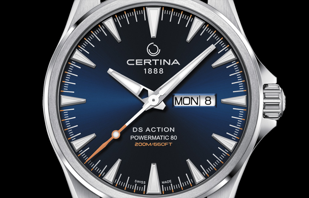Новая модель Certina DS Action Day-Date Powermatic 80 от швейцарской часовой компании Certina выпускается в трех вариантах: темно-синий циферблат с лучистой отделкой и коричневым кожаным ремешком (Ref. C032.430.16.041.00), с черным циферблатом и черным кожаным ремешком (Ref. C032.430.16. 051.00) и с черным циферблатом и браслетом из нержавеющей стали (Ref. C032.430.11.051.00). Ее дизайн выполнен в элегантном спортивном стиле.