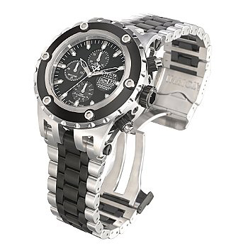 Invicta Reserve Speedway Automatic Chrono Название модели звучит как лозунг: Reserve speedway!, который можно перевести как «Обзаведись своим скоростным участком!». Призыв к тем, кто обожает скорость. Да и сами часы получили автоспортивную внешность, особенно благодаря мощному 24-миллиметровому браслету с крупными литыми звеньями, который напоминает мотоциклетную цепь. Крепится он к корпусу четырьмя выдающимися на Змм в стороны винтами, которые отворачиваются автомобильным 6-гранным ключом. Впрочем, Invicta Reserve Speedway чем-то похожа и на оружие. Внушительный стальной корпус окрашен в антрацитовый цвет. Материал корпуса напоминает вороненую сталь, из которой обычно делают оружие, но на самом деле это высоколегированный сплав L316 с черным покрытием методом ионного напыления. И поверхность корпуса истинно оружейная не матовая, но и не полированная. Даже черно-перламутровый циферблат здесь напоминает камуфляж. А между тем он многоуровневый: первый слой перламутр, второй золотые колодцы счетчиков и стрелки, на третьем расположены светящиеся метки, на четвертом их дублеры на фланце и, наконец, на пятом шкала. Стрелки толстые золотые. Минутная имеет 4 люминесцентные точки, которые напоминают пулевые отверстия, часовая три. На одном кончике секундной стрелки окрашенный люминесцентом наконечник, а на коротком эмблема. Прекрасно подойдет этот хронограф и профессиональным дайверам. Водонепроницаемость превосходная до 200 метров. Ободок оснащен трещоткой с шагом 1 щелчок = 1 минута. Он вращается в одну сторону, имеет 60-минутную разметку и светящиеся 6 точек, которые повышают высоту корпуса еще на полмиллиметра. Кнопки хронографа закручиваются и имеют золотые торцы. На стальном ободе задней крышки, которая имеет сапфировое окно и крепится 6 винтами, сквозь окно можно рассмотреть, что сектор автоподзавода имеет тот же цвет, что и корпус часов, а мосты и платины механизма декорированы тонкими полосками. В корпусе установлен автоматический хронограф ЕТА 2894 с весьма любопытным (характерным для знаменитого высокочастотного зенитовского калибра El Primero) расположением дополнительных циферблатов: 30-минутный и 12-часовой счетчики соответственно на отметках «9 и 6 часов», боковые секунды на отметке «3 часа», а дата на «4.30». В общем, этот прибор подойдет для любого настоящего мужчины, будь то стритрейсер, охотник или дайвер. Ведь не зря же название швейцарской марки Invicta из города Ла-Шо-де-Фон произошло от слова Invincible, что означает «непобедимый». Основанная в 1837 году компания Invicta сегодня считается одной из самых быстрорастущих часовых групп Швейцарии. Кроме титульных часов Invicta Group выпускает б самых разнообразных марок на собственной мануфактуре под названием Technica Swiss Ebauche. Invicta Reserve Speedway Automatic Chrono Ref.: 4386 Корпус: 45 мм, высота 14 мм, из хирургической стали 316L с черным ионным покрытием, сапфировое стекло и задняя крышка на 6 винтах с сапфировым окном, вращающийся позолоченный безель, заводная головка и кнопки хронографа завинчиваются, WR 200 м Циферблат: перламутровый, многоуровневый, стрелки и метки позолочены и покрыты люминесцентным составом Trinite Механизм: автоматический хронограф ЕТА 2894, частота 28 800 пк/час, запас хода 44 часа, мосты и платины декорированы вручную Функции: часы, минуты, боковые секунды, хронограф с центральной стрелкой, 30-минутным и 12-часовым счетчиком, календарь-дата Брас