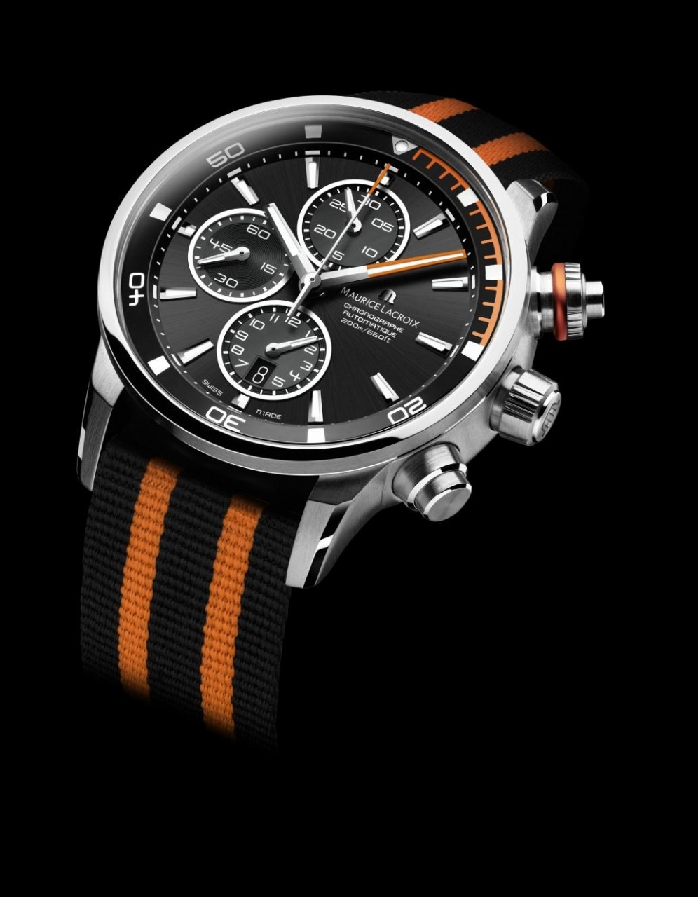 Новинка имеет полированный круглый корпус из нержавеющей стали, диаметром 43 мм, водонепроницаемый до 200 метров. На хронографическом пушере, расположенном на 2 часах, имеется головка для управления внутренним вращающимся кольцом с дайверской разметкой (оранжевого, синего или черного цвета), с ободком также - оранжевого, синего или черного цвета. Сапфировое стекло защищает черный циферблат с накладными стальными индексами и стрелками (в т.ч. минутная - оранжевого, синего цвета или без окраски), покрытыми люминесцентным составом.