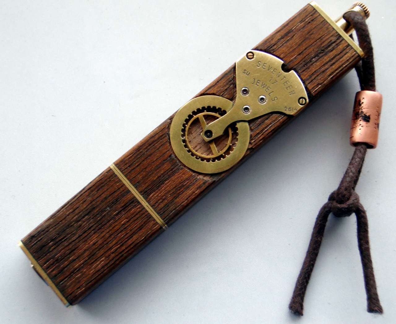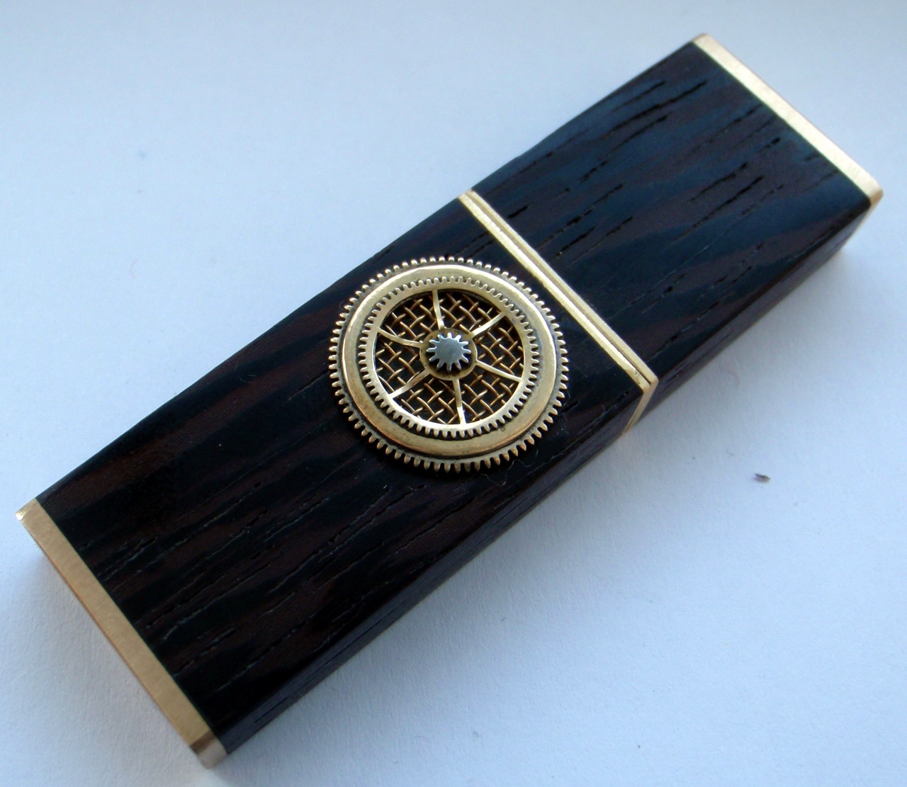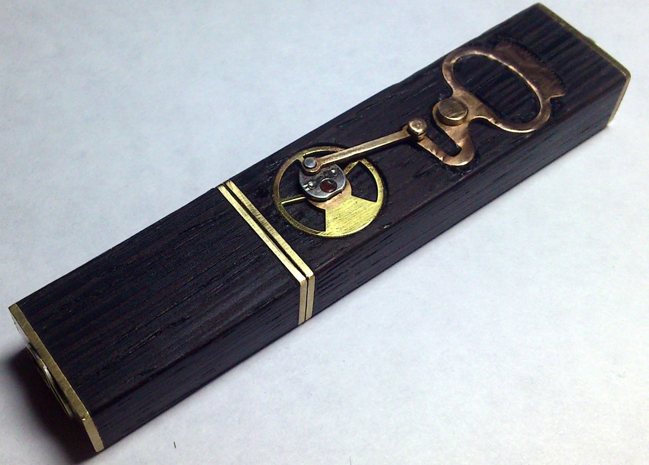 Добавлю кое-что... Начинка от братьев-китайцев, светодиодный фонарик с аккумулятором и солнечной батарейкой. Корпус из какого-то стабилизированного дерева, обрезок которого мне прислали в подарок. Боковые вставки из кокоболо. Остальное - латунь, останки часов, патинирование в парах аммиака. Вложение 967142 Вложение 967143 Вложение 967144 Вложение 967145 |