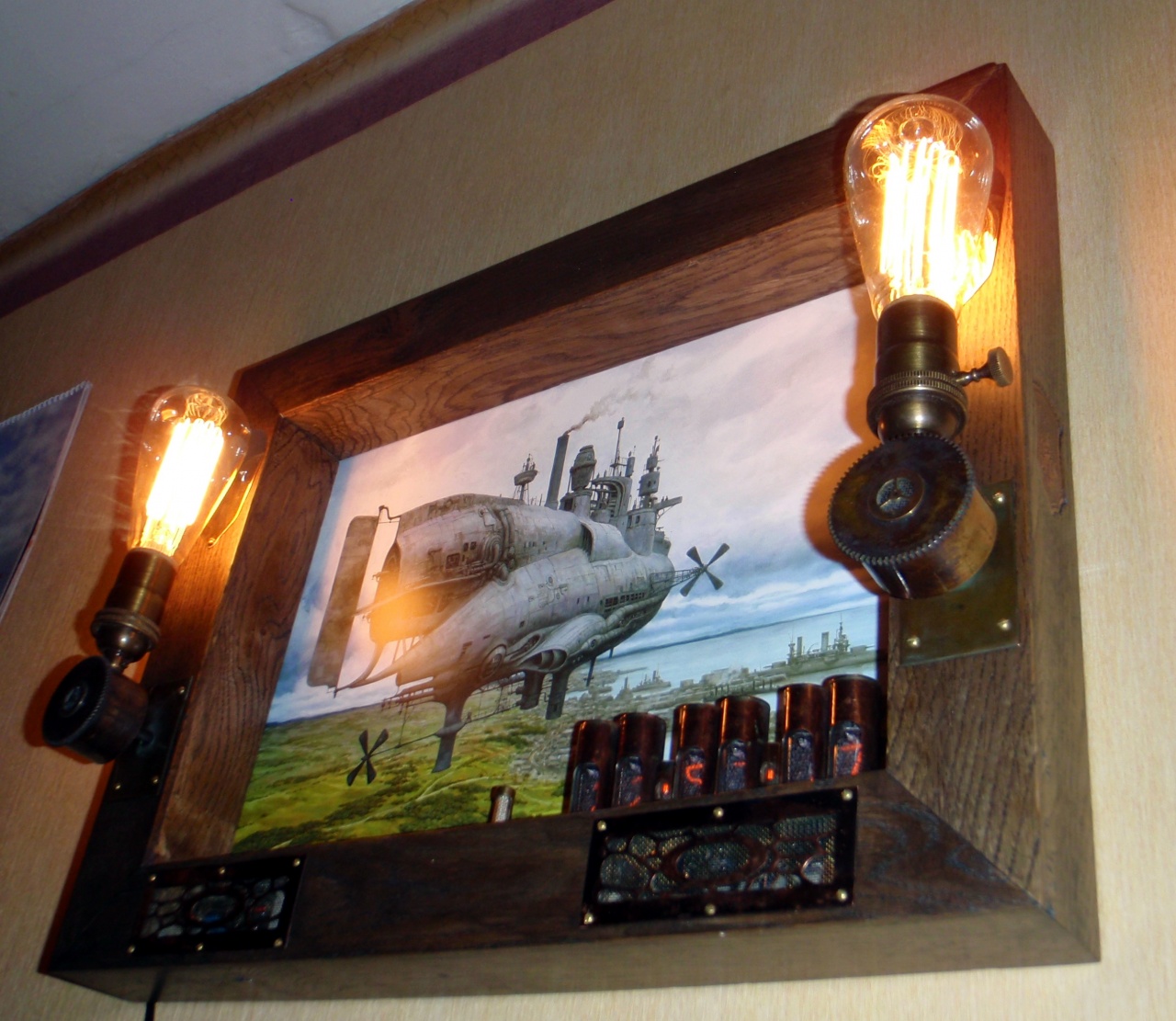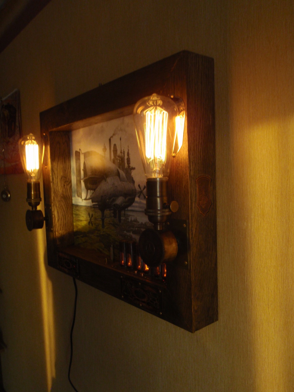 Тема совсем заглохла, оживлю. Тут и старые часы применены (держатели ламп из заводных барабанов настенных Янтарь и местами шестеренки) и часы присутствуют. :)