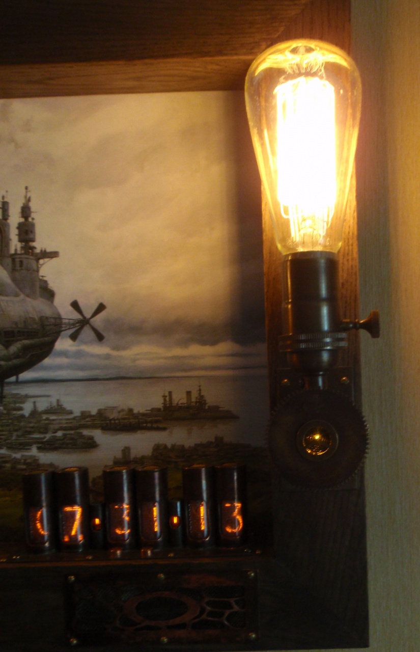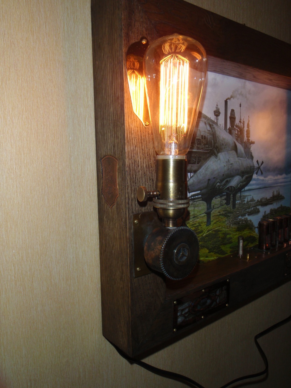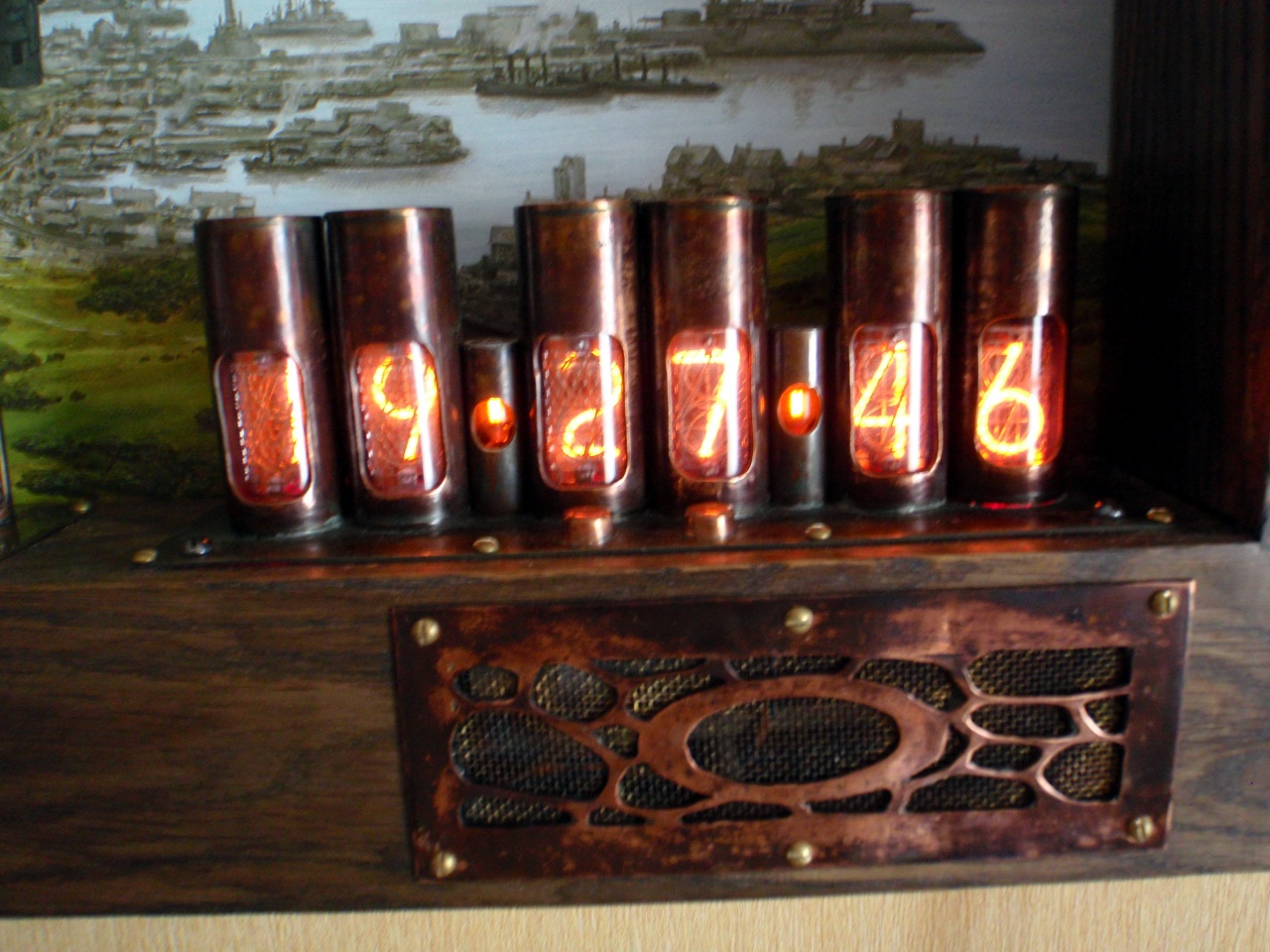 Супер.У самого руки чешутся применить ламповые часы.Патроны для ламп Эдисона можно взять от старых,довоенных,советских светильников,они как-раз латунные,думаю на барахолках можно найти.Электронику БП можно скрыть если сетку заменить декоративной тканью от динамиков старого радио,воздух конечно бкдет проходить хуже-но будет,Кстати старое радио может снабдить и нужным проводом питания и сетевой вилкой в духе времени.