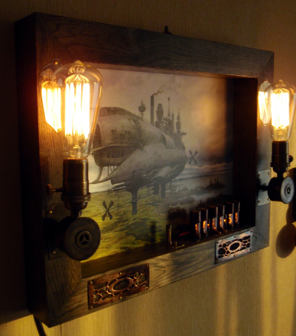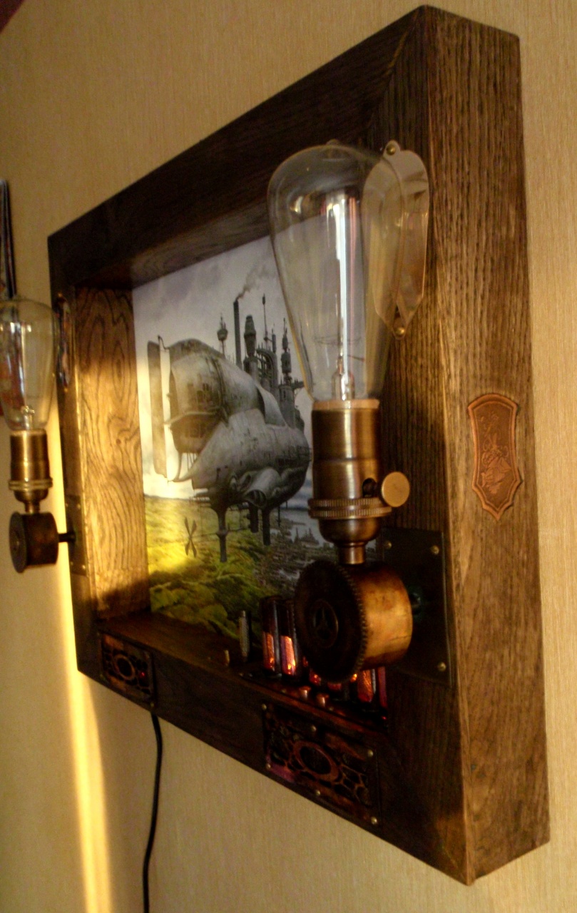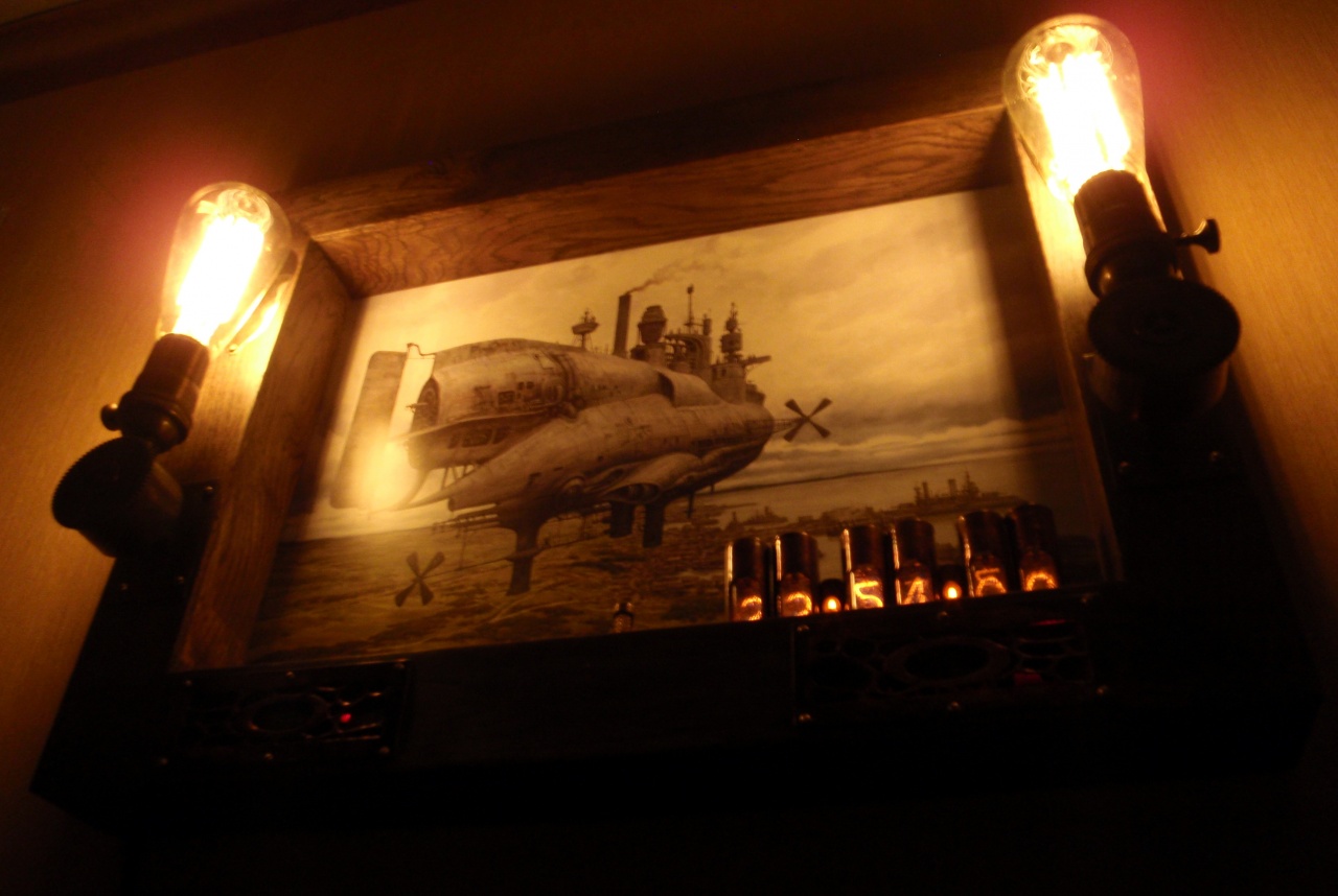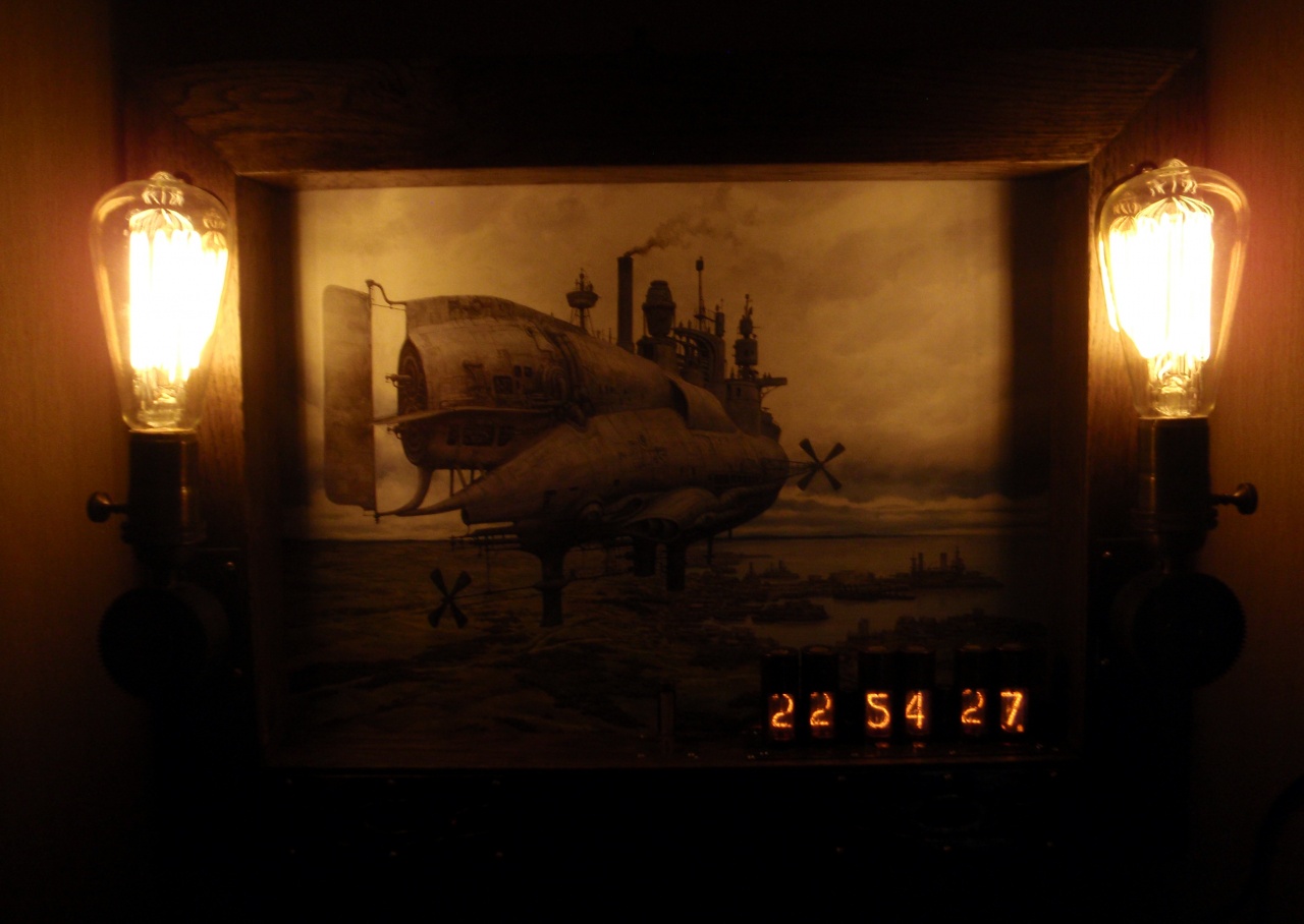 Супер.У самого руки чешутся применить ламповые часы.Патроны для ламп Эдисона можно взять от старых,довоенных,советских светильников,они как-раз латунные,думаю на барахолках можно найти.Электронику БП можно скрыть если сетку заменить декоративной тканью от динамиков старого радио,воздух конечно бкдет проходить хуже-но будет,Кстати старое радио может снабдить и нужным проводом питания и сетевой вилкой в духе времени.
