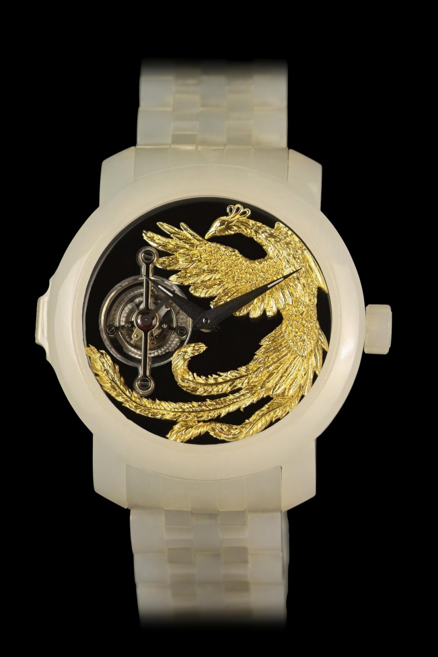 Белый нефрит Hetian (самый ценный вид нефрита), использованный для изготовления этой модели, добывается в Китае в провинции Синьцзян. На протяжении более 7000 лет нефрит служил символом идентичности знати и крупных судейских, и лишь они имели право носить изделия из него. Элегантный черный эмалевый циферблат, на нем - изображение птицы Феникс из 18-каратного золота, изготовленное под микроскопом. В китайской мифологии, Феникс (Фэн Хуан) является символом высокой добродетели и благодати, силы и процветания. Он представляет собой союз инь и янь. На 9 часах размещен турбийон. Модель оснащена китайским механизмом с турбийоном. По материалам: http://blog.watchuseek.com/2011/03/g...priceless.html http://www.luxist.com/2011/03/28/lon...te-jade-watch/ |