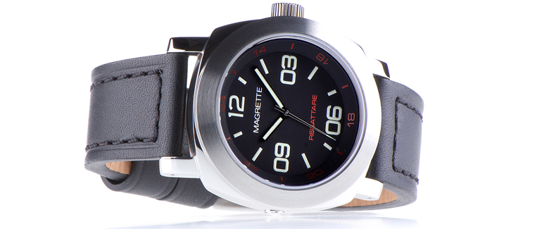 Диаметр корпуса у новинки составляет 44 мм, водонепроницаемый до 500 метров. Завинчивающаяся заводная головка расположена на 3 часах. Выпуклое сапфировое стекло с антибликовым покрытием защищает циферблат с арабскими цифрами, часовыми индексами, часовой и минутной стрелками, покрытыми люминесцентным составом SUPERLumiNova C3 белого цвета. Модель оснащена японским автоматическим механизмом MIYOTA 9015, с функциями индикации часов, минут, секунд (посредством соответствующих центральных стрелок). Поставляется на кожаном ремешке. Лимитированный выпуск по 600 экземпляров каждой из трех версий модели. Источник: http://www.tempusfugitwatch.com/2013...-magrette.html |