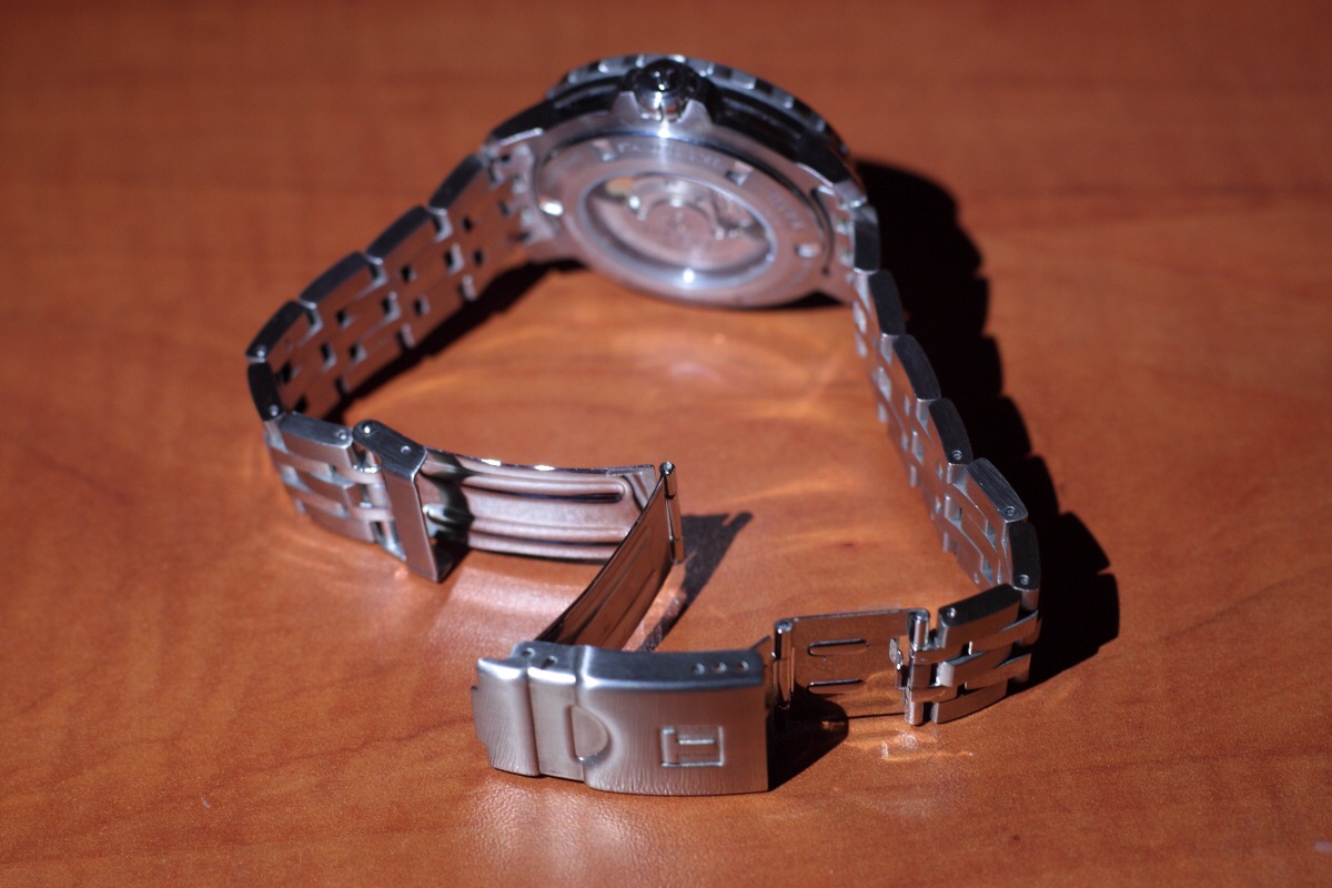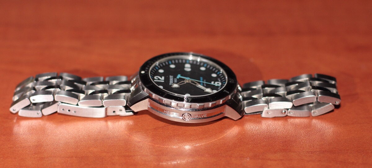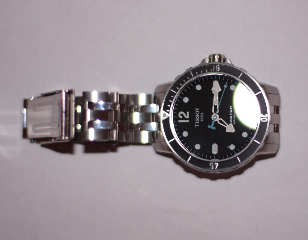 После распаковки начал вертеть в руках. Итак, а теперь перейдем к часам. Безель, несмотря на то, что сделан из крашеной синим стали, он на 0,5 мм утоплен внутрь между металлическими направляющими и соответсвенно риск случайно зацепить и пошкрябать (то, чего как раз на лонжиновской гидре опасался) покрытие немного снижен. Он односторонний - 60 щелчков :o (для сравнения на m-force 120 было) и не слишком широкий (уже чем у штайна и гидры, и значительно уже чем у m-force), ну да ладно я ведь не для вращения покупал. Далее циферблат: приятный синий цвет: не настолько темный как у гидры и синего m-force, но и не слишком наcыщенный. Темно-голубой в общем (не уверен удастся ли передать на фото цвет, но выглядит он более сдержанно. тем те же штайны OCEAN One Premium Blue). Циферблат трехуровневый, дата на 3 часа, метки накладные. Отделка мне показалось даже слишком простой. Метки просто нанесены на циферблат без всяких окантовок (на дате она также отсутствует). Металлический кант был бы им к лицу. А теперь о неприятном: люм на 9 и 11 часах нанесен плохо, как будто кисточкой помазали, а потом промакнули поролоном, правда если не знаешь где искать, то и не найдешь (смеха ради попросил других лиц посмотреть метки, не все нашли). Подозреваю, что это косяк моего конкретного экземпляра, может я придираюсь, но с фактами не поспоришь (тем более на ориентах такого не было, да и на штайнах тоже, орис также промолчал). Перейдем к стрелкам. И снова отделка выдает уровень часов. Здесь люм нанесен хорошо, но вот сами стрелки отделаны очень простенько: секундная покрашена в серый матовый, часовая и минутная также серый матовый, правда обработаны "шероховато" и немного поблескивает кант. Надо полагать это дизайнерская фича. В целом приемлемо, но взгляд они не цепляют. Заводная головка завинчивается на удивление легко, гораздо легче, чем в конквестах (напомню, что и те и эти 30bar). Имеется прозрачная задняя крышка, через которую можно глянуть механизм. Отделки почти нет, разве что на роторе, кроме логотипов tissot и seastar нарисован какой-то драндулет: то ли вертолет, то ли газонокосилка :D, я так и не понял (а скорее всего какое-то специализированное судно). Все надписи на крышке на месте, по левому боку - гелиевый клапан, он подписан, а на толкателе написано He (обозначение гелия). Да, чуть не забыл - подсветка красивая - голубоватый оттенок очень хорош. После зеленого люма штайна и m-force, моим глазам ночью она приятна (если что я эту неделю в них еще и сплю). А теперь перейдем к браслету. Забегая вперед хочу сказать, что знал результат заранее, так как примерил в магазине кварцевый хронограф с керамической вставкой. В общем по браслету больше всего вопросов. Во первых он не стандартный - шириной 19 мм. Зачем его было таким делать не пойму. На этих часах и 20 и 22 хорошо бы смотрелись, но 19, да еще и на дайвере. WTF??? Браслет интегрированный крайние и центральная вставки сатинированны, остальные слегка полированы. Браслет литой, довольно легкий. Легче, чем на конквестах и тем более на m-force. Застежка: стандартная складная клипса. Но исполнение мрак и ужас на крыльях ночи :eek: На фото специально сфотографировал ее и бабочку конквеста, чтобы было понятно почему так плохо. Во первых штамповка: у кого были/есть m-force, то вы знаете, что крайние звенья и застежка на часах штампованная и лязгает если потрясти руку. Так вот - тут все гораздо хуже. Хуж