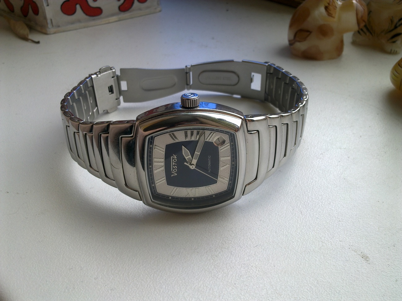 Итак, часы Восток престиж были заказаны мной через Мераном, и уже через шесть дней после отправки я получил заветную коробочку синего цвета , где на бархатной подушечке возлежали вожделенные часы, представляюцие собой классический трехстрелочник с бочкообразным циферблатом. Вложение 404834 Вложение 404835 Вложение 404846Вложение 404926 Вложение 404847 Вложение 404848 Вложение 404849 Циферблат. Циферблат глубокого церного цвета , гильошинированный круговыми рисками , часовые метки выполнены в виде арабских цифр с высотой шрифта от 5 до 7 мм светло зеленого цвета , материал отрисовки цифр - светомасса. Окошко даты расположено между 4 и 5, не бросается в глаза , но читается хорошо. Стрелки выполнены мечеобразной формы с нанесением светосостава кроме секундной, самой простой формы но органично вписывающейся. Циферблат был выбран именно черный, как наиболее констрасный и читаемый. На свету проявляется эффект разбегающихся от центра циферблата лучей треугольной формы. Информативно цифер не перегружен под 12 часовой меткой надпись метализированными буквами на латинице Vostok, над 6 часовой меткой automatic- лаконично, без усложнений. Корпус. Корпус часов -матированная нержавеющая сталь, профилные стороны (правая и левая)-полированы. Форма корпуса в виде вытянутой бочки с размером по экватору у ЗГ 38 мм без головки и 41 мм с головкой. Головка высотой 3,5 мм Ф5 мм, выглядит пропорционально. Справа и слева от головки на профильной стороне невысокие , около 2 мм приливы. Головка не закручивается, однако вращается с усилием, что свидетельствует о наличии сальника завадного ключа и водозащите в барах или метрах производителем не указанных. Стекло минеральное , плоской формы, с небольшой фаской по периметру. Форма стекла -вытянутая бочка, способ крепления вклеивание на прозрачный герметик, который практически не заметен. Вокруг стекла (не знаю точно термин) скажем , фальшбезель шириной 4 мм с цифровыми метками 15-30-45. Напротив 12ти часовой отметки два трегольных углубления , залитых светомассой, однако известен вариант и с заполнением краской. Отделка копруса, как и сам корпус производят хорошее впечатление качественой вещи, что подтвердили все знакомые и друзья, приняв Восток за иномарочные часы(не китайские). Браслет. Браслет это важная деталь, которая создает тактильные ощущения во многом влияющие на наше желание заменить его на ремень, даже на брендовых часах. Здесь,на мой взгляд, чистопольцы на высоте и вот почему. Браслет представляет собой литые звенья закрепленные на силиконовой профилированной ленте шириной 10 мм стальными штифтами Ф около 1 мм. силиконовая лента входит в выточку на корпусе и закреплена штифтом насквозь не только через силиконовую ленту, но и через последнее стальное звено. Таким образом конструкция браслета такова, что обеспечивает некоторую упругость, сходную с силиконовым ремнем и приятные тактильные и визуальные ощущения от браслета. Сейчас пока могу сказать, что ощущения от него положительные, не щиплется и не болтается, не шкворчит, выглядит отлично. Однако без специнструмента удалить-поставить звено не получится. Защелка браслета в 3 сложения в выдавленным логотипом В в кружочке. Задняя крышка. Для ценителей задних крышек могу сказать, что крышка в также бочкообразной формы . Гравировка с изображением проекции земного шара и надписью сни