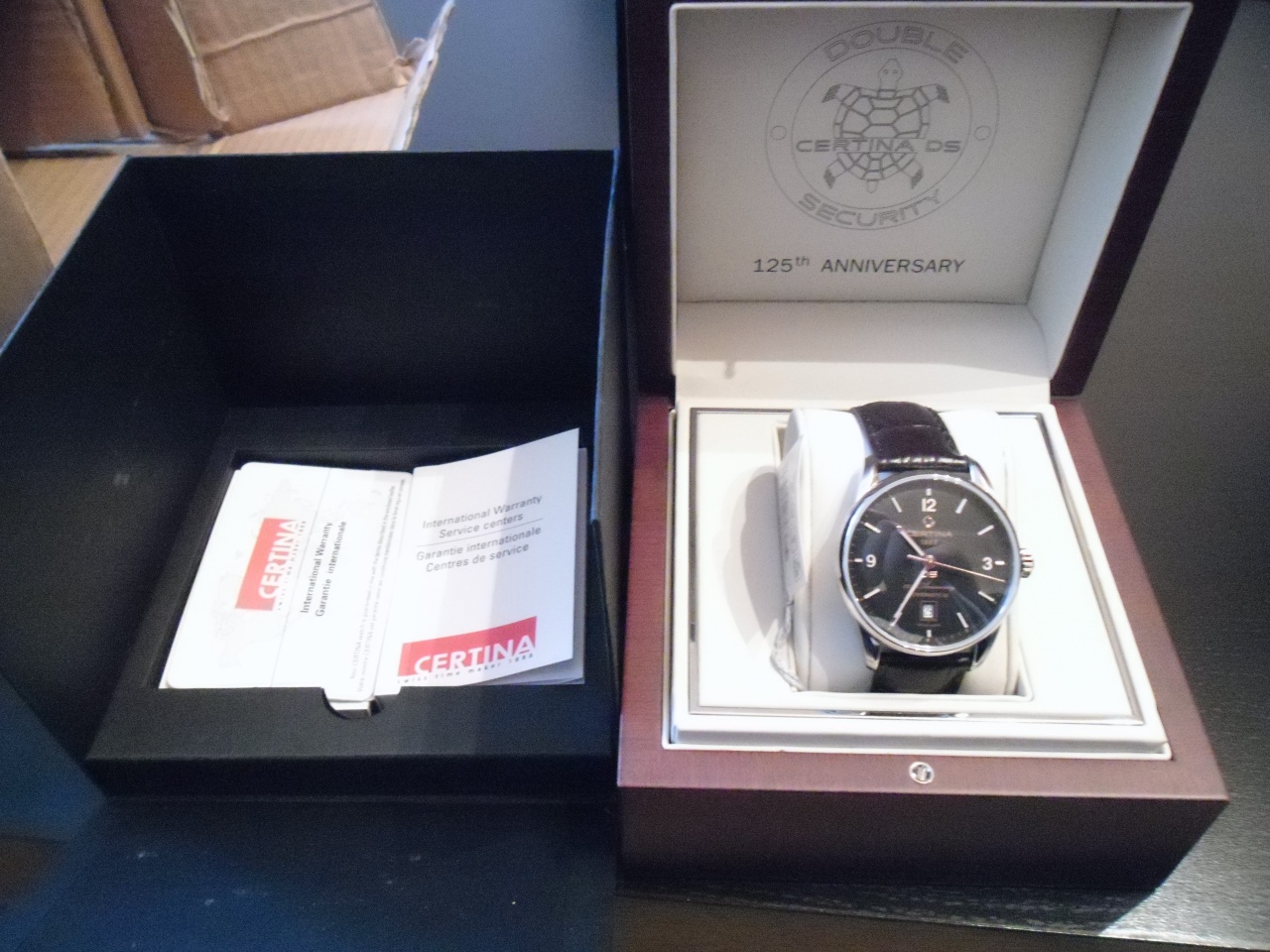 Посмотрел, подержал в руках Certina DS Automatic ― 125th ANNIVERSARY LIMITED EDITION. Понравились. Всё что видел до сих пор у Сертины не вдохновляло - слабая обработка корпуса. Я понимаю, что не премиум класс, а средняя группа Свотч, но всё же. А вот эта лимитка сделана очень хорошо. Выглядит по-настоящему дорого. Прекрасная обработка фигурного корпуса с выпуклыми боками, полировка в зеркало. Сапфировое куполообразное стекло с антибликом и циферблат, достойный всяческих похвал, - неброское розовое золото стрелок и цифр с индексами в винтажном стиле. Новый оригинальный логотип Сертины. Читаемость прекрасная. Механизм, правда, со странным декоражем - на роторе черепаха распятая, чёрно травлёная, 23 камня powermatic 80. Удивила ещё тройная надпись - 125th ANNIVERSARY LIMITED EDITION - на роторе, на корпусе сзади и на циферблате - не много ли? Продавец сказал, что идут очень точно - проверял на витрине и завода действительно хватает на 76-78 часов при полном заводе вручную. Ремень, без всякого сомнения, Hirsch duke - я его вслепую знаю. Кстати и шкатулка понравилась - качественная и красивая. Вот думаю забрать что ли 385Х из 5000 шт? Потому как их в Москве практически не осталось...