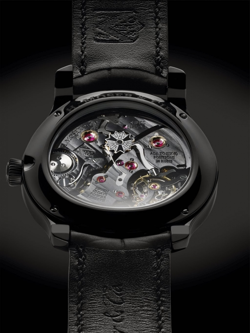 Поставляется на черном ремешке из кожи аллигатора с карбоновым покрытием и с титановой застежкой с черным DLC-покрытием.