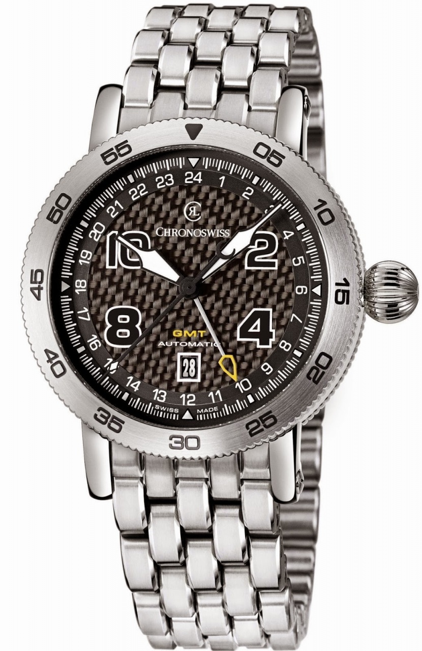 Новинка имеет круглый корпус из нержавеющей стали, диаметром 44,0 мм, толщиной 13,9 мм, водонепроницаемый до 100 метров. Крупная завинчивающаяся рифленая заводная головка, луковицеобразной формы, расположена на 3 часах. Вращающийся безель, с зубчатым внешним краем, с DLC-покрытием черного или серебристого цвета. Завинчивающаяся задняя крышка часового корпуса глухая. Сапфировое стекло с антибликовым покрытием защищает циферблат с арабскими цифрами и стрелками, покрытыми люминесцентным составом SuperLuminova. Модель оснащена швейцарским автоматическим механизмом Chronoswiss C.289, диаметром 25,6 мм, толщиной 4,1 мм, на 21 камне, с балансовой частотой 28800 полуколебаний в час (4 гц), 42-часовым запасом хода, функциями индикации часов, минут, секунд (посредством соответствующих центральных стрелок), даты (посредством соответствующего цифрового указателя в апертуре, расположенной на 6 часах) и времени второго часового пояса (посредством соответствующей центральной GMT-стрелки, на круглой 24-часовой шкале, расположенной на периферии циферблата). Калибр отлично отделан и декорирован. В частности, ротор автоподзавода скелетонизирован, с "женевскими волнами" ("Côtes de Genève"), мосты и платина с отделкой Perlage. Поставляется на резиновом ремешке, или на текстильном ремешке, или на браслете из нержавеющей стали. Источник: http://www.masterhorologer.com/2015/...urce=BP_recent |
