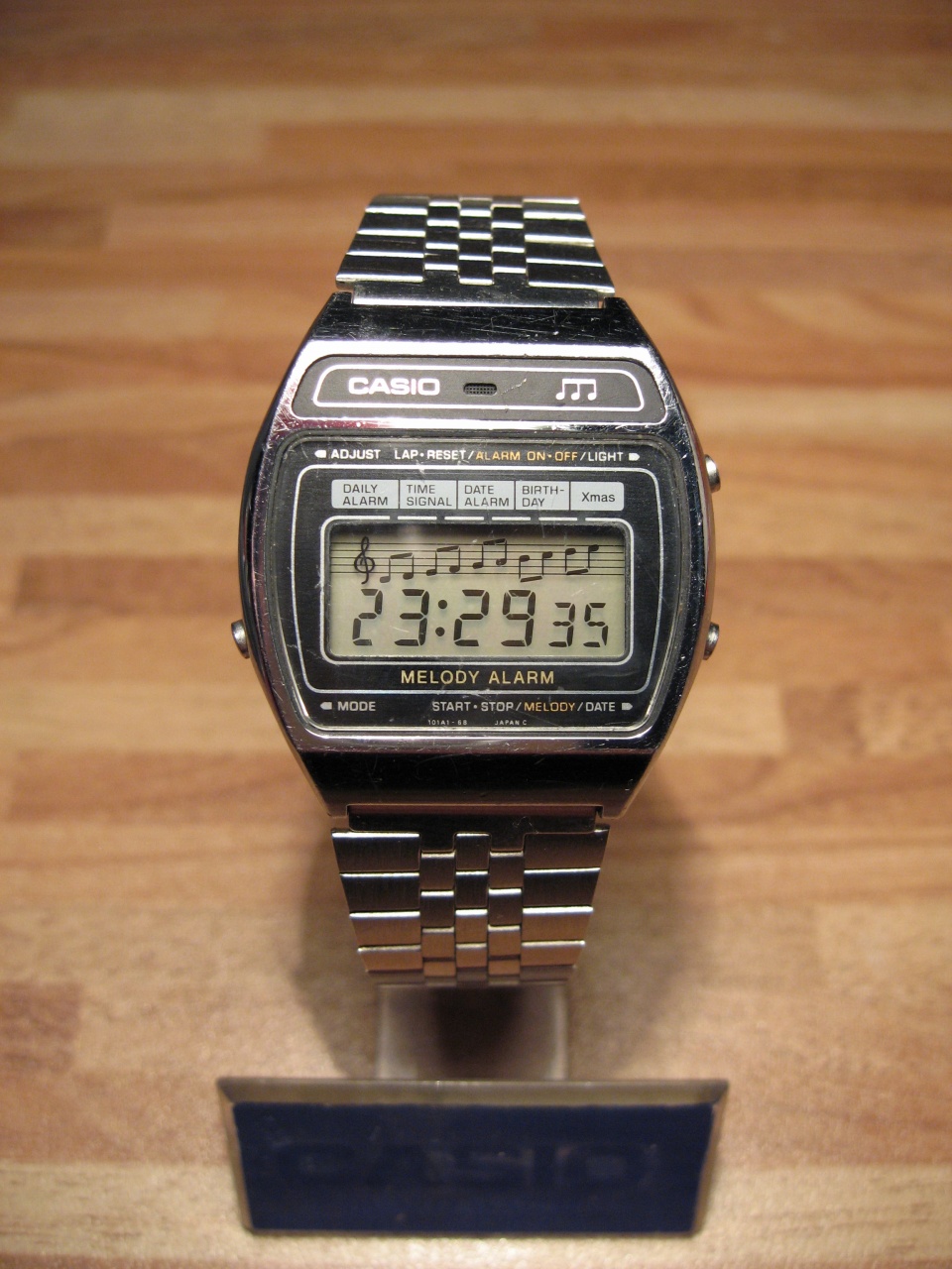 Casio M-1230 - одна из оригинальных и музыкальных моделей славных 80-х. У неё всё очень музыкально, от нажатия кнопки до звукового сигнала. Переключение из режима в режим сопровождается звучанием двойных восьмых нот (ДО-РЕ, МИ-ФА и т.д.). Что касается мелодий, всего их одиннадцать. Семь на каждый день недели, одну из 2-х можно поставить на конкретную дату, Happy Birthday звучит на день рождения и Jingle Bells на Рождество.