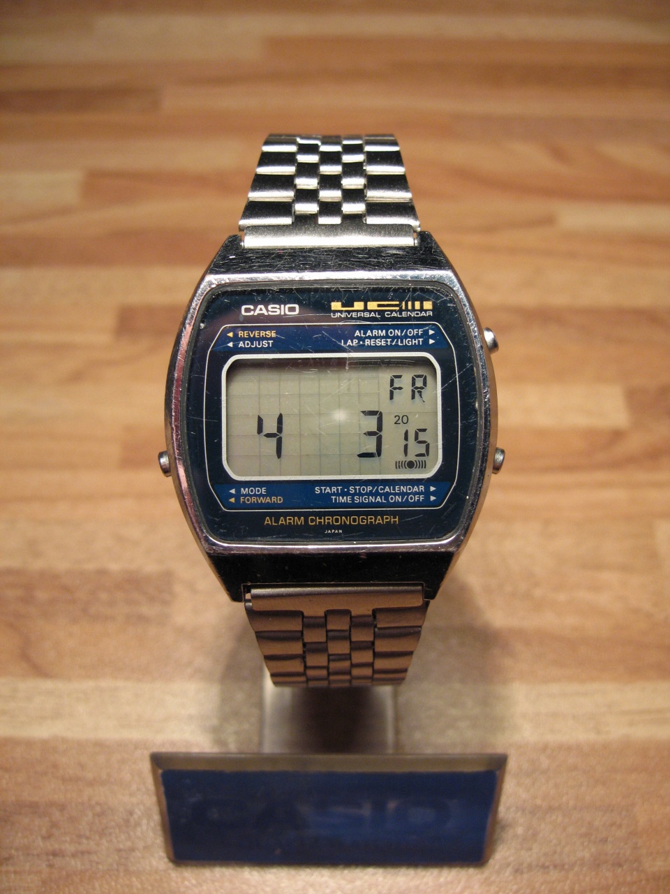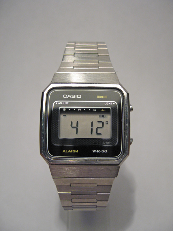 Casio A4100W - очень редкая модель из той же эпохи, начала 80-х.:) По крайней мере, в интернете об этой модели я вообще не нашёл никакой информации. Часы приехали из Японии. По размеру небольшие и функций у них немного. Однако добротный хромированный корпус, хороший браслет, линии и большинство надписей на стекле сделаны зеркальными.