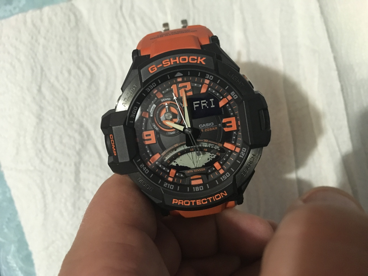 sembond, Если ещё актуально, то не советую брать эту модель. Как оказалось они и не очень крепкие, после падения недавно на льду, нижний экран разбился. Часы были под рукавом легкой куртки. Но время продолжают показывать верно, внешних повреждений дргуих нет, только секундная стрелка теперь цепляется за минутную и не может её обогнать, видимо немного погнулась.