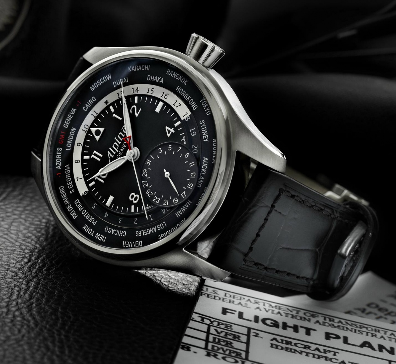 У новинки круглый корпус, изготовленный из нержавеющей стали, диаметром 44 мм, водонепроницаемый до 100 метров. Крупная рифленая заводная головка расположена на 3 часах. Сапфировое стекло установлено на передней стороне корпуса и на его завинчивающейся задней крышке. Циферблат матово-черный с арабскими цифрами, часовой и минутной стрелками, покрытыми белым люминесцентным составом. Модель оснащена мануфактурным автоматическим механизмом Alpina AL718, на 26 камнях, с балансовой частотой 28800 полуколебаний в час (4 гц), 42-часовым запасом хода, функциями индикации часов, минут, секунд (посредством соответствующих центральных стрелок), даты (на круглом аналоговом указателе, расположеннном на 6 часах), мирового времени (посредством внутренней круглой вращающейся 24-часовой шкала с указателем "день/ночь", а также названий городов мира по периферии циферблата). Калибр отлично отделан и декорирован, в частности, посредством перлажа, "женевских волн" ("Côtes de Genève") и с воронеными винтами. Поставляется на черном ремешке из кожи аллигатора, с застежкой из нержавеющей стали. Источник: http://www.watchreport.com/2013/12/a...atch+Report%29 |
