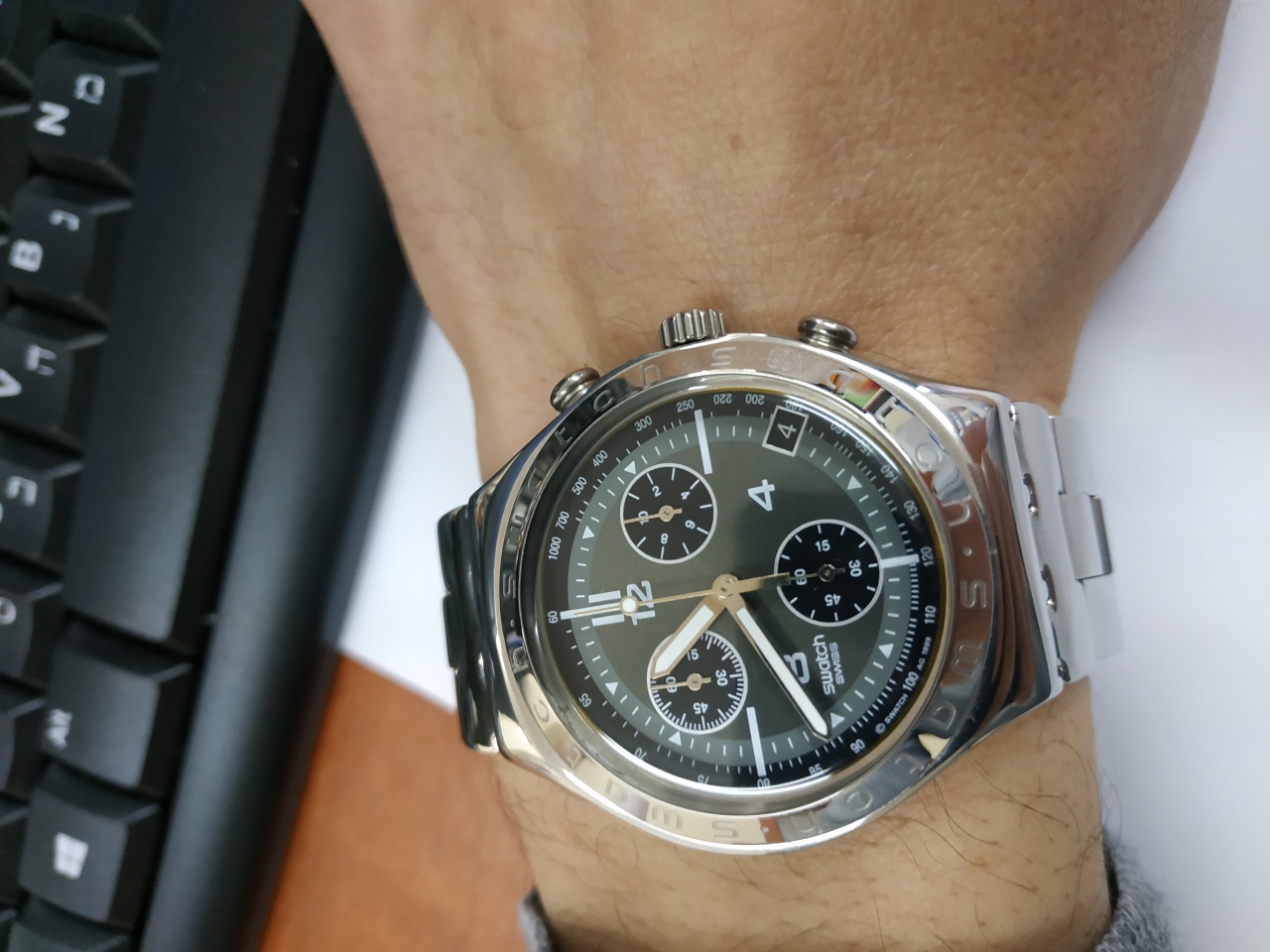 А то у супруги есть ретрограды, у дочки аж двое Свотчей, а у меня не было до сих пор в пользовании таких часов. Кварцевый хронограф. Swatch ironi спорт хронограф. Самую большую по размерам у них модель: корпус аж 47 мм, но за счет коротких дужек, прекрасно легли на мое запястье 18,5 см., но уже впритык, на грани допустимого. На запястье меньше 18 см уже не сядут, будут слишком большими казаться. Черный стальной корпус с ПВД покрытием, черный цифер, черный стальной неподвижный безель, черный каучуковый ремень. В общем почти стиль Стеллс. Почти, потому что и на безеле и на цифере нанесена желтая разметка, чередующаяся с фиолетовыми метками и стрелками. В общем разбавляет неплохо черный цвет и придает нотки спортивности, без того крайне брутальным часам.:) Ремешок кстати застегнулся аккурат на среднюю дырку, то есть не такой уж и длинный, думаю максимум на запястье 20 см будет уже на последнюю дырку застегиваться. Бакля тоже вся стальная с черным ПВД покрытием с надписью Свотч, никакого пластика. Крепление ремешка естественно фирменное свотчевское, но за счет черного цвета корпуса и ремешка, эти фирменные четыре дужки для крепления ремня вообще не заметны, чего я и хотел, так как мне никогда не нравилось когда их явственно видно на контрастном с корпусом ремне. Я подбирал себе как раз таки что то неубиваемо-надежное с неплохим исполнением на замену моим стальным Шокам. Не всегда бывает комфортно надевать Шоки на те же велопокатушки, большие они и тяжеловатые 200 грамм. Иногда под шорты хочется чего то полегче, поменьше и чтоб живучее было, но при этом с неплохим исполнением, достаточно качественное. Пластиковые Шоки модели 5600 или 2900 не хотел, ибо пластик как то не особо нравиться, потому и Шоки себе изначально стальные купил, нравиться сталь. Стальная же модель 5000 Шоков также достаточно тяжелая, плюс в некотором роде гламурно-офисная и для всякого рода экстремального рода занятий, подходит мало, ибо зацарапается очень быстро. Да и вообще двое Шоков в сете, считаю уже перебор, так как стараюсь не покупать себе в сет модели одного бренда, тем более одной линейки. И потом также бывают ситуации, когда после лёгкого такого экстрима, на который не наденешь механику, ибо жалко, приходиться встречаться по работе с людьми и менять часы просто некогда. Либо наоборот - после деловой встречи, например, сразу ехать к приятелю на дачу, куда механику также жалко надевать. Имеющиеся же Шоки стальные уж вообще для экстрима конкретного типа рыбалки, леса, спортзала. А вот эти Свотч как раз способны выдержать такой лёгкий экстрим типа велосипеда или шашлыка и в них же вполне приемлемо потом пойти на работу или встретиться с контрагентами а после встречи опять же укатить на дачу к другу. По весу опять же не слишком тяжелые, потому как на каучуковом ремне со стальной баклей, но при этом и не легкие как пластиковые Шоки, ибо корпус большой и полностью стальной. В общем весят 127 грамм - прям то что доктор прописал!:D П.с. Фотографии на руке конечно же по старой доброй традиции прилагаю. |