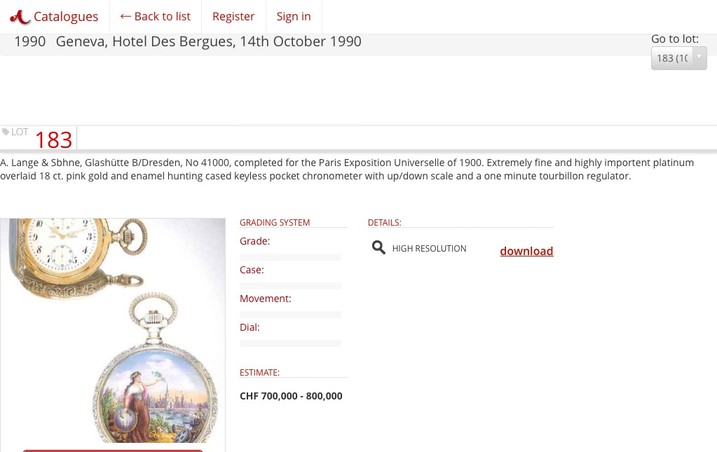 Это известные часы, описанные в литературе. Всего компанией ALS было изготовлено 12 карманных часов с минутным турбийоном в период с 1892-1925 г.г., 7 из них имели индикатор запаса хода. Указанные часы с номером 42501 изготовлены в 1903 г., циферблат с 4-х слойной эмалью, турбийон с хронометрическим спуском, корпус гравирован профессором Carl Ludwig Graff, картуш с эмалированной головой Минервы в венке и с ожерельем (другие варианты с гравированной головкой, например знаменитые 42500). Вложение 1522606 Вложение 1522607 |