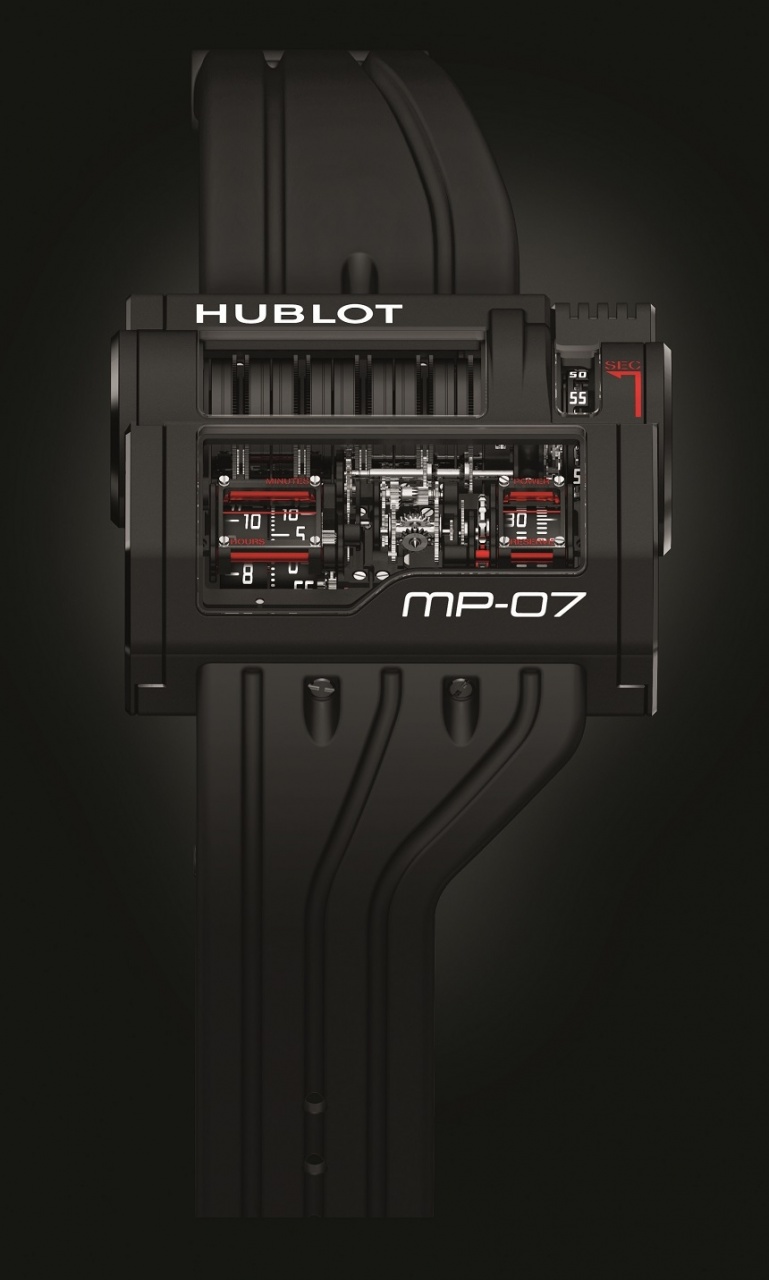 Взято от сюда http://watch.by/hublot-mp-07-42-days-power-reserve ну и прилеплю В рамках салона Baselworld 2016 компания Hublot среди прочих моделей представила очередную интерпретацию эффектных MP-05 La Ferrari, дебютировавших на часовом рынке в 2013 году. От своего предшественника модель MP-07 42 Days Power Reserve отличается чуть более угловатым силуэтом корпуса и, как понятно из названия, не таким внушительным, но все же впечатляющим запасом хода 42 дня. Продолжая сравнение с нашумевшими MP-05 La Ferrari, стоит отметить, что конструкция механизма новинки претерпела небольшие изменения: вместо 11 заводных барабанов в этой модели использовано 9 и расположены они на этот раз не вертикально, а горизонтально, что несколько облегчает процесс считывания показаний. Информацию о часах и минутах можно прочесть на двух барабанах, расположенных в левой стороне циферблата, в правом верхнем углу размещен барабан с индикацией секунд, о чем сообщает красная стрелка на боковой поверхности корпуса, а справа находится индикатор запаса хода. Как и раньше, индикатор секунд «привязан» к парящему турбийону. Работу модели обеспечивает калибр HUB9007.H1.PN с балансовой частотой 21 600 пк/час, собранный из 487 деталей. Вложение 1579626 Вложение 1579627 Вложение 1579628 |
