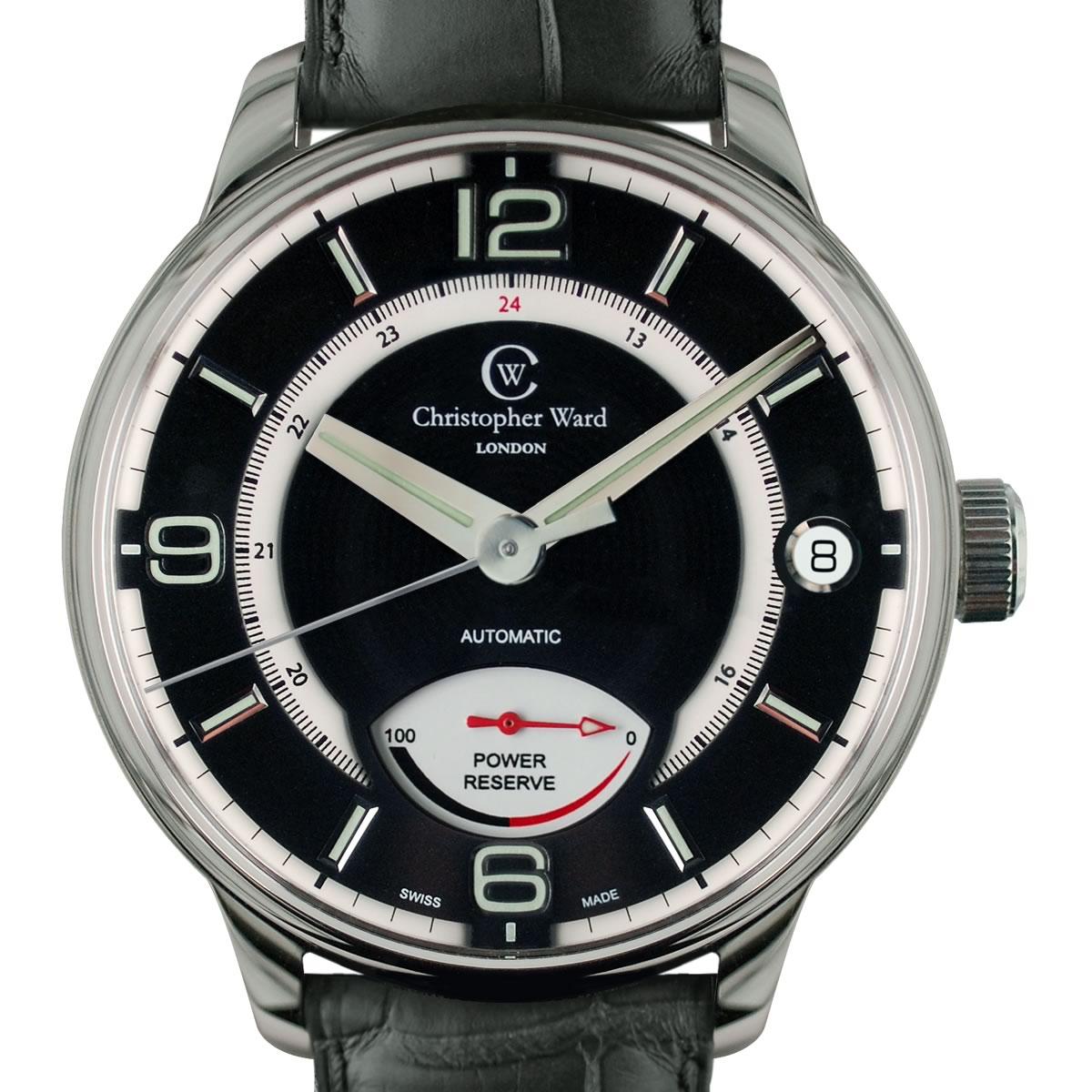 Новая модель C-90 Power Reserve от британской часовой компании Christopher Ward, выпускающей свои часы в Швейцарии, имеет круглый полированный корпус из нержавеющей стали, диаметром 43 мм, толщиной 13 мм, водонепроницаемый до 50 метров. На торце заводной головки, расположенной на 3 часах, имеется логотип бренда. Сапфировое стекло установлено на передней стороне корпуса и на его завинчивающейся задней крышке. Циферблат матово-черный, с белыми фланцем и круглой шкалой, размеченной от 13 до 24 часов. Накладные арабские цифры и часовые индексы, так же как и часовая и минутная стрелки, покрыты белым люминесцентным составом.