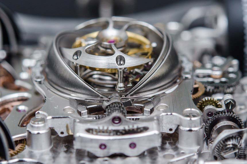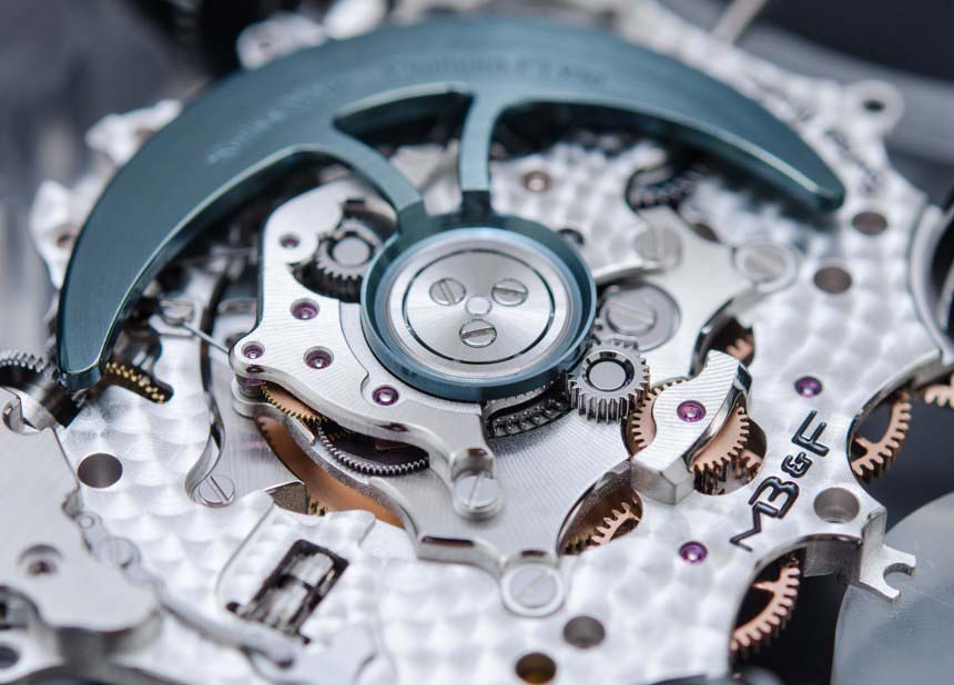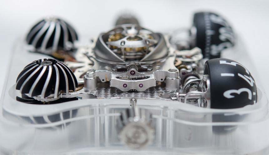 В сапфировых пластинах часов MB&F HM6 Sapphire Vision в общей сложности девять куполов: четыре на дне и пять на верхней пластине. Каждая деталь выточена из твердого кристалла сапфира, второго самого твердого природного минерала на Земле после бриллиантов. Для получения таких странных форм спецами MB&F использовались инструменты с бриллиантовыми наконечниками. Процесс кропотливый и длительный: обработка каждой пластины занимает сотни часов.