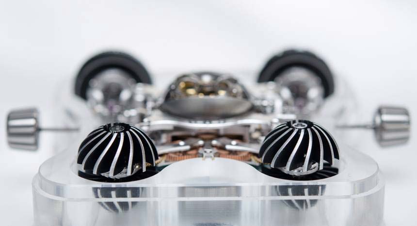 Сапфировые часы MB&F HM6 Sapphire Vision не самый удобный наручный аксессуар для отслеживания времени, однако они созданы для другого – чтобы наслаждаться сложными движениями турбийона под прозрачным куполом в центре и другими элементами часового механизма. В двух других сапфировых сферах на лицевой стороне часов находятся массивные алюминиевые турбины, которые начинают отчаянно вращаться при малейшем движении запястья (они связаны с ротором автоподзавода). С противоположной стороны еще два сапфировых купола, накрывающих алюминиевые полусферы с показателями часов (слева) и минут (справа). Для защиты турбийона от ультрафиолетового излучения предусмотрен дополнительный титановый купол, который можно задействовать в любое время на свое усмотрение.