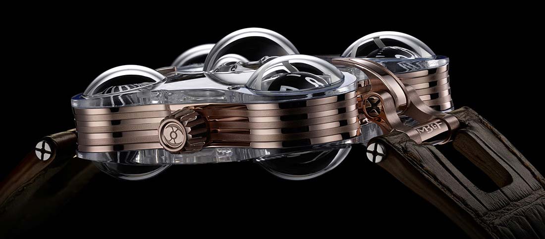 Корпус MB&F HM6 Sapphire Vision просто гигантский по меркам наручных часов: 51 х 50 х 22,7 мм с уникальной поворотной системой крепления ремешка. Как и другие творения мануфактуры MB&F, новые сапфировые часы HM6 зрелищны и узнаваемы. Они, без преувеличения, задают новые стандарты для больших и элегантных часов.