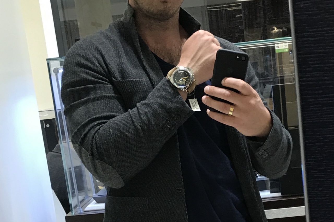 Съездил на примерку! Без вашего авторитетного мнения ну никак! Начнем по порядку! 1312 - гораздо удобнее своих старших братьев (312-х) На руке сидят очень удобно! За счет более плоской задней крышки. По ощущениям близко к Люминору 44мм. Но (!) не дает покоя синяя секундная стрелка! С одной стороны, вроде интересно, нестандартно, но думается мне она надоест очень быстро (?) Вложение 1797839 1362 - Их мерила супруга, но я тоже решил посмотреть. С синим ремнем секундная стрелка вполне неплохо сочетается, не так мозолит глаз! Вполне неплохо сели, кстати. Вложение 1797852 Основной их плюс - это формат "унисекс". Так как, с недавних пор, моя любимая жена тоже подхватила вирус ЧБ и засматривается на Памы! Эти можно носить по-очереди :D вот они же на ее руке (запястье 15.5см): Вложение 1797853 Вложение 1797854 Еще мерила 574-е , но ее не вставили! Хочу, говорит Пам со скобой (!) болезнь прогрессирует :D Вложение 1797863 Вложение 1797864 Ну а приехал я в магазин собственно с одной целью... Примерить очередной раз 372-е ))) И вот тут, друзья мои, просто необходима ваша помощь!!! так как когда их вынесли, у меня аж дыхание замерло!!! Ну пипец как они мне нравятся!!! Итак: запястье 18-18.5см еще раз, не стесняясь и не лукавя, Ваше мнение, господа? Вложение 1797872 Вложение 1797873 И еще 425-й из Радиков очень нравится!!! Вложение 1797874 Но это уже совсем другая история ;) P.S. Сорри за перевернутые снимки, не понимаю почему одни ровно, другие криво ) |