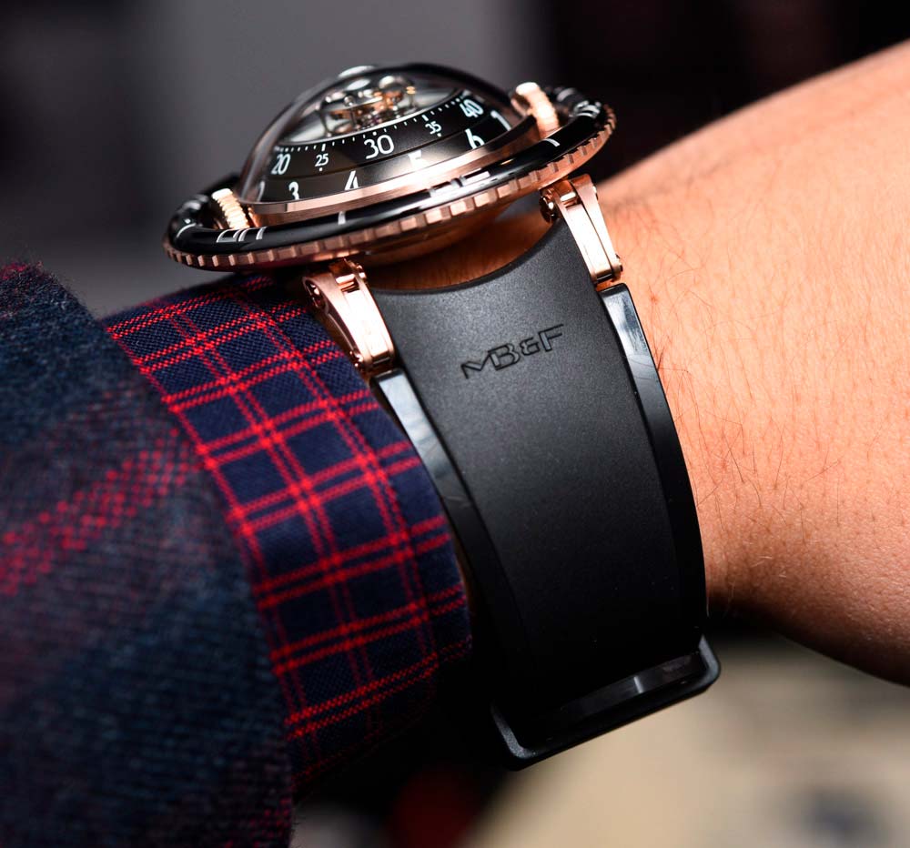 Сферический корпус часов MB&F HM7 Aquapod имеет водостойкость 50 метров. Этого более чем достаточно для плавания, без глубоководных погружений. Учитывая реальные потребности покупателей, это далеко не те часы, которые наденут для дайвинг-тура: их предпочтут надеть для светского вечера или деловой встречи.