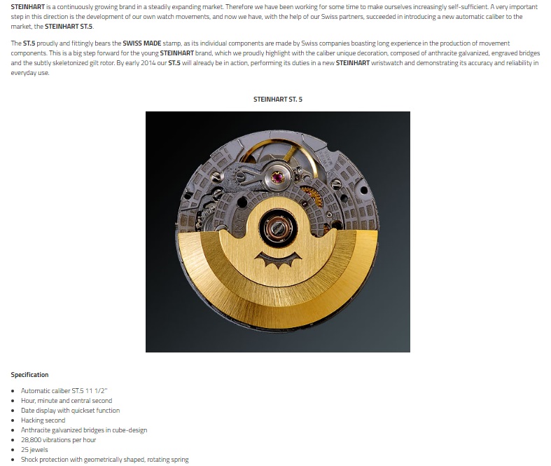 https://www.steinhartwatches.de/en/st1-premium http://forum.watch.ru/attachment.php...3&d=1493663775 Вложение 1784723 а вот st5 сделан на фиг знает какой базе (информация на сайте Штайна отсутствует, равно как и опозновательное клеймо на платине калибра и обоработка деталей явно не ЕТАшная): https://www.steinhartwatches.de/en/st5?___from_store=de http://forum.watch.ru/attachment.php...4&d=1493663775 Вложение 1784724 ежели st5 был бы на базе ЕТА, то об этом всенепременно было бы упомянуто. герр Гюнтер никогда не упускал возможности сослаться на сильных мира сего. нисколько не удивлюсь, ежели базой для st5 окажется китайский калибр, пересобранный в Швейцарии. |