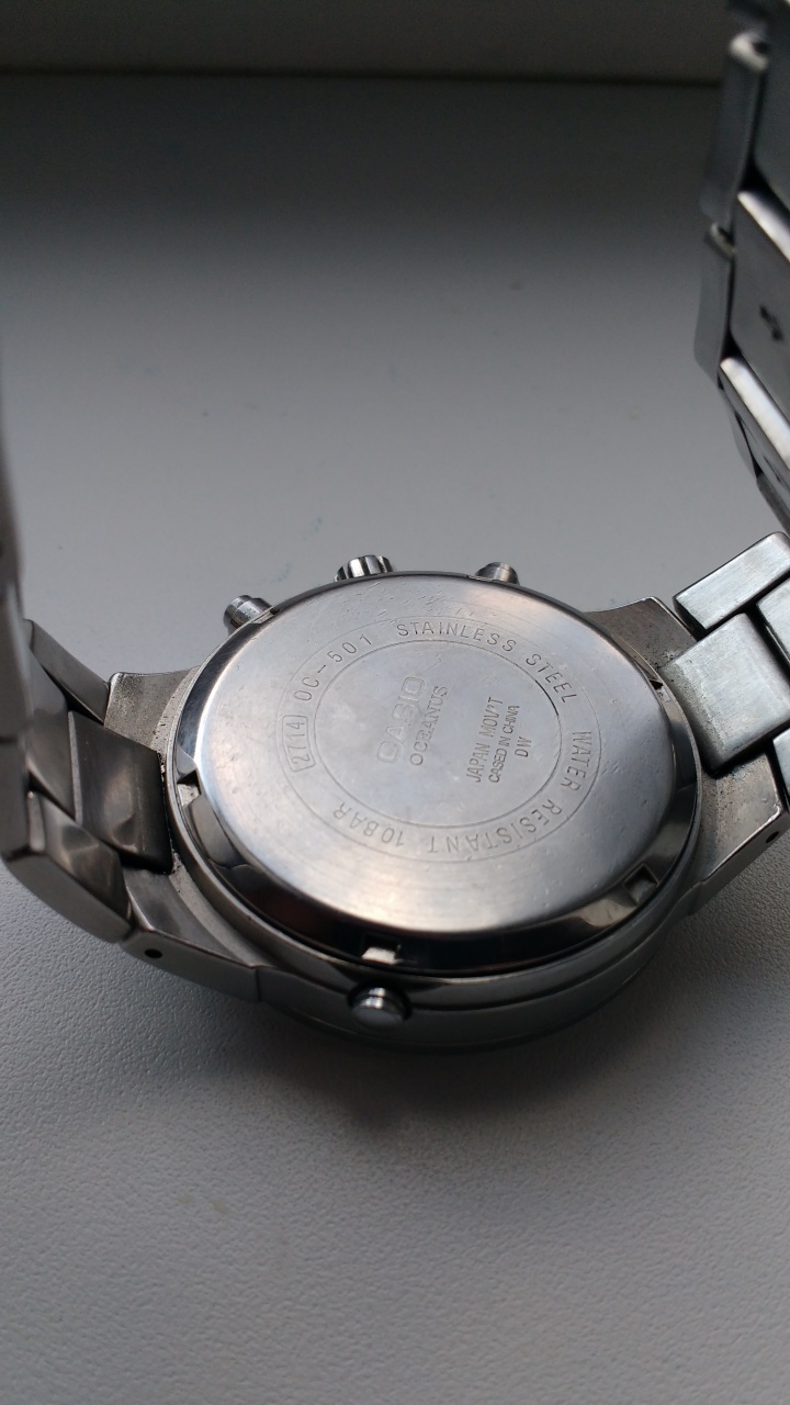 Брал на ebay у продавца 4-watches. Вместе с доставкой часы обошлись в 76$. http://cgi.ebay.com/ws/eBayISAPI.dll...=STRK:MEWNX:IT Самая дешевая доставка заняла 15 дней до Москвы, что есть гуд =) Продавец запаковал упаковку с часами в картонную коробку и заклеил обычным скотчем. Ничего нигде не помялось. Часы оказались малость тяжелее, чем я ожидал =) Но не сильно тяжелее моих старых Casio Fishing Gear. Вероятно, дело тут в литом стальном браслете. В данной модели есть будильник. Включается он кнопкой слева от циферблата, причем, чтобы включить будильник, кнопку необходимо подцепить ногтем и вытянуть где-то на 0.5 — 1мм. При вытягивании кнопки, стрелка около надписей ON/OFF перещелкивается на ON. Время срабатывания выставляется отдельной стрелкой. После оттягивания заводной головки до первого щелчка, поворачивание головки от себя перемещает стрелку будильника, к себе — меняет день месяца. Точность выставления будильника ± 3-5 минут. Пикает секунд 15. Если не выключить — через минуты 2 опять пикает. Кстати, заводная головка здесь закручивается на резьбу. Теперь про хронометр. Тут всё стандартно. Верхняя кнопка — старт-стоп, нижняя — сброс. Нижний циферблат — доли секунды. Крутится 30 секунд, потом идет на «0» и переходит на измеренное значение при остановке. В режиме обычных часов показывает секунды. Левый циферблат — часы. Непонятно зачем оно надо. Нечасто мне нужен секундомер на 12 часов. Верхний секундомер — минуты. В реальности — черт ногу сломит разобрать какую минуту он показывает :) Кстати в часах есть возможность выставления нулевой отметки для большой секундной стрелки и нижнего циферблата. http://arscorp.ru/images/oc-500/P1060888.JPG http://arscorp.ru/images/oc-500/P1060892.JPG http://arscorp.ru/images/oc-500/P1060893.JPG http://arscorp.ru/images/oc-500/P1060895.JPG http://arscorp.ru/images/oc-500/P1060896.JPG http://arscorp.ru/images/oc-500/P1060897.JPG http://arscorp.ru/images/oc-500/P1060898.JPG http://arscorp.ru/images/oc-500/P1060900.JPG http://arscorp.ru/images/oc-500/P1060901.JPG http://arscorp.ru/images/oc-500/P1060902.JPG http://arscorp.ru/images/oc-500/P1060908.JPG |