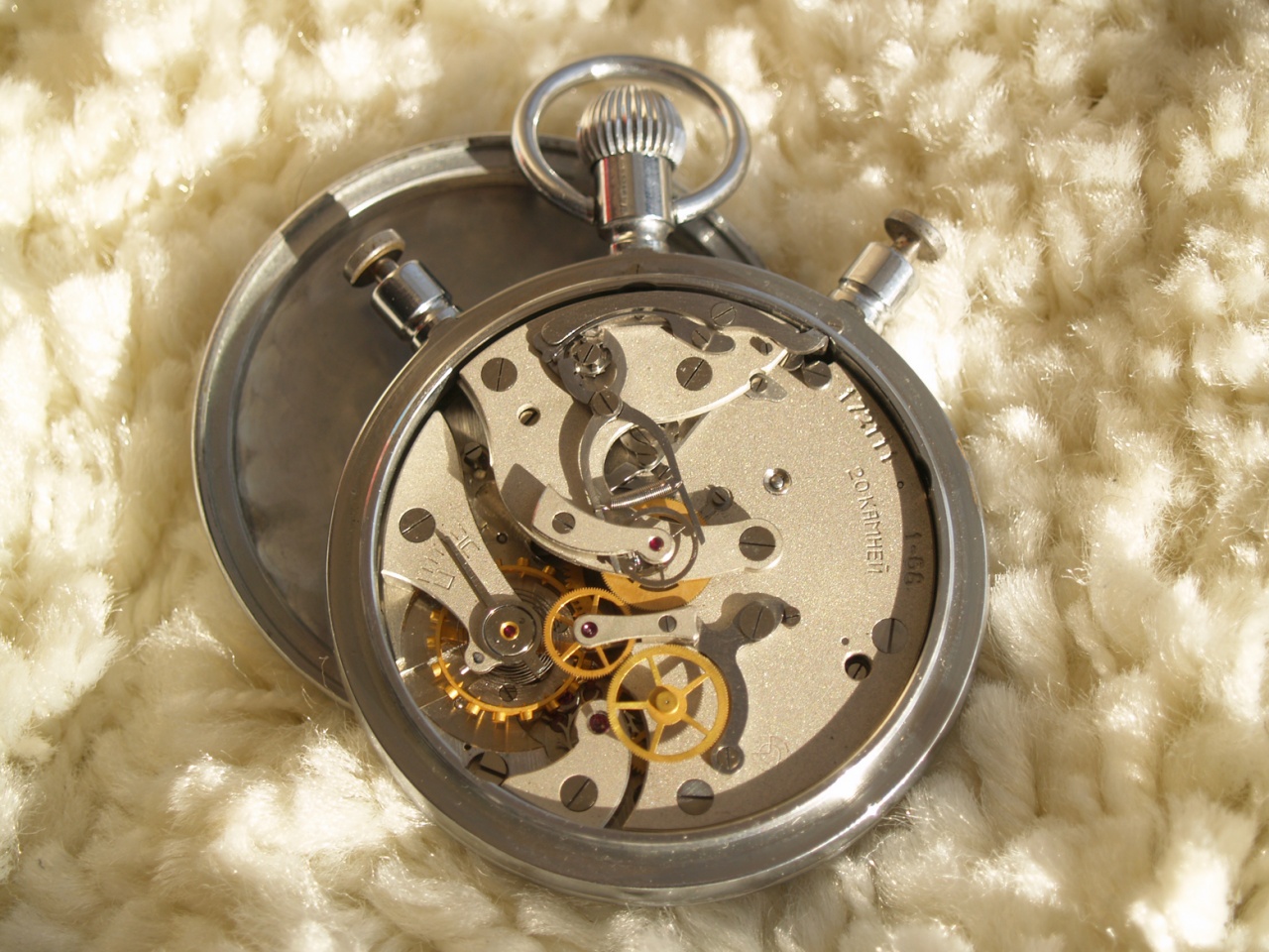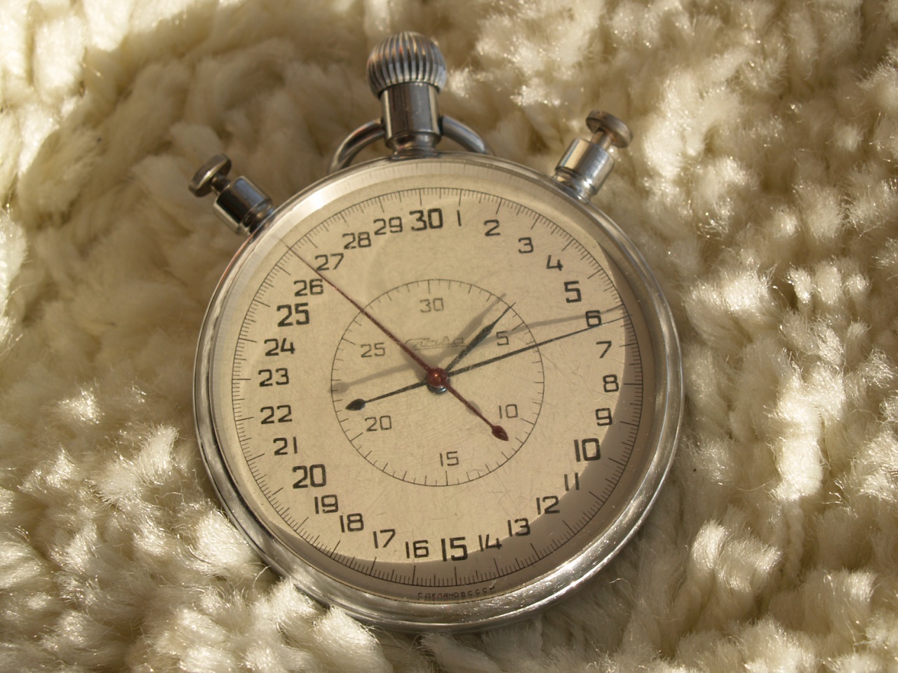 Показывал уже в "трофейной" теме, оставлю теперь в профильной. Редчайший вариант славовского сплит-секундомера двустрелочника с разметкой на 60 секунд. Где-то мелькал на форуме уже,но я не нашел.