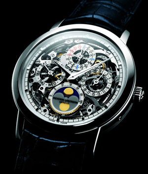 Она оснащена механизмом Omega 8403, на 39 камнях, с двусторонним автоподзаводом, с балансовой частотой 25200 полуколебаний в час (3,5 гц), коаксиальным спуском, двумя заводными барабанами (установленными последовательно), запасом хода 60 часов. Калибр отлично отделан, в том числе платина, родированные винты, ротор из 18-каратного красного золота. Круглый платиновый корпус, диаметром 41 мм, толщиной 12,50 мм, водонепроницаемый до 100 метров. На лицевой стороне корпуса размещено выпуклое сапфировое стекло с антибликовым покрытием, на задней его стороне - также сапфировое стекло. На сапфировом-же циферблате имеются накладные часовые индексы из 18-каратного белого золота. Стрелки, также, из 18-каратного белого золота. Ремешок из матовой черной кожи с застежкой из полированной платины. Лимитированный выпуск 88 экземпляров. Источник: http://professionalwatches.com/2011/...leton_pla.html |