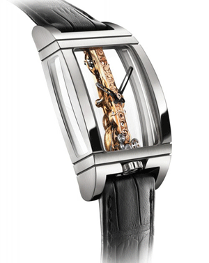 Круглый корпус из 18-каратного белого золота, диаметром 38 мм, толщиной всего 5,34 мм. Сапфировое стекло на лицевой стороне корпуса и на его задней крышке. Модель оснащена ультратонким мануфактурным автоматическим механизмом 1200S, толщиной 2,4 мм, полностью вручную скелетонизированным и отделанным (в частности, сатинированием, полированием, со скошенными платиной и мостами). Об исключительной сложности отделки механизма свидетельствует то, что, к примеру, толщина колес у него составляет 0,12 мм, а вес микроротра с черным покрытием - всего два грамма. Функции: индикация часов и минут, посредством соответствующих центральных стрелок. Причем, стрелки, выполненные в стиле Dauphine, с черным покрытием, контрастируют со светлым скелетонизированным калибром, что обеспечивает часам хорошую считываемость показателей времени. Поставляется на черном ремешке из крокодиловой кожи с застежкой из белого золота. Цена модели составляет 50000 швейцарских франков. Вложение 175190 Вложение 175191 Источник: http://www.worldtempus.com/en/news/t...lano-skeleton/ |