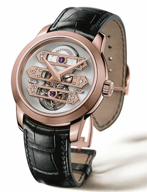 Круглый корпус, диаметром 43 мм, из 18-каратного розового золота с гильошированным безелем. Крупная золотая заводная головка на 3 часах. Сапфировое стекло на лицевой стороне корпуса и на его задней крышке. Циферблат отсутствует; часовая, минутная (обе с "яблоками Бреге") и секундная стрелки - из розового золота. Механизм полностью скелетонизированный и черный. Причем, даже красные рубиновые камни зачернены. Функции: индикация часов, минут (посредством соответствующих центральных стрелок) и секунд (посредством секундной стрелки на 6 часах). Черный ремешок из крокодиловой кожи с застежкой из розового золота. Учитывая уникальность и, самое главное - количество ручного труда, затраченного на создание этого произведения часового искусства, цена модели относительно невысока - $ 45675. Вложение 174394 Источник: http://professionalwatches.com/2011/...som_black.html |
