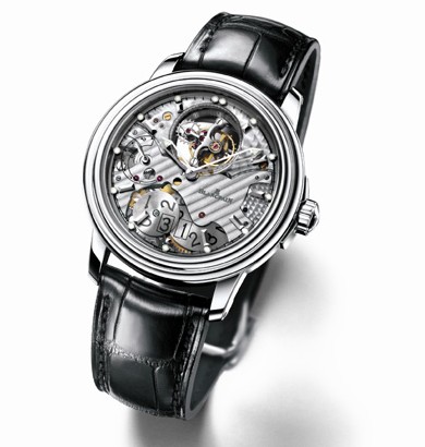 Круглый корпус из 18-каратного белого золота, диаметром 42 мм, водонепроницаемый до 30 метров. Рифленая заводная головка из 18-каратного белого золота, с синим сапфировым кабошоном. Сапфировое стекло на лицевой стороне корпуса и на его задней крышке. Циферблат, как таковой, отсутствует. Стрелки ромбовидные, из вороненой стали. Модель оснащена механизмом с ручным заводом 9457 MC, отмеченный женевским клеймом ("Geneva Seal"), состоящим из 175 деталей, с парящим турбийоном, скелетонизированными мостами в виде арабских цифр, диаметром 33,5 мм, толщиной 5,48 мм, на 19 камнях, с балансовой частотой 21600 полуколебаний в час, запасом хода 50 часов. Ремешок черный, из кожа аллигатора, с двойной раскладной застежкой из 18-каратного белого золота. Лимитированный выпуск 100 экземпляров. Вложение 98187Вложение 98189 Источник: http://journal.hautehorlogerie.org/e...on-watch-2413/ |