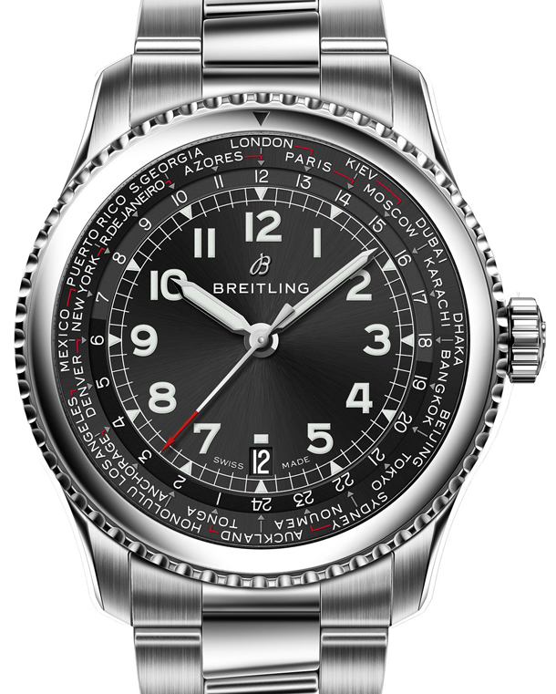 В рамках новой коллекции Breitling Navitimer 8, часовая мануфактура Breitling представила ворлдтаймер Navitimer 8 Unitime. Новинка представлена в корпусе из нержавеющей стали диаметром 43 мм на выбор – с черным или серебристым циферблатом. Корпус часов имеет классическую форму, а циферблат придает ему современный вид. По внешнему ранту циферблата расположена шкала с нанесенными на нее 24-мя названиями городов, что позволяет узнавать время в 24-х часовых поясах одновременно. В часах ,как эти, обычно безель фиксированный.