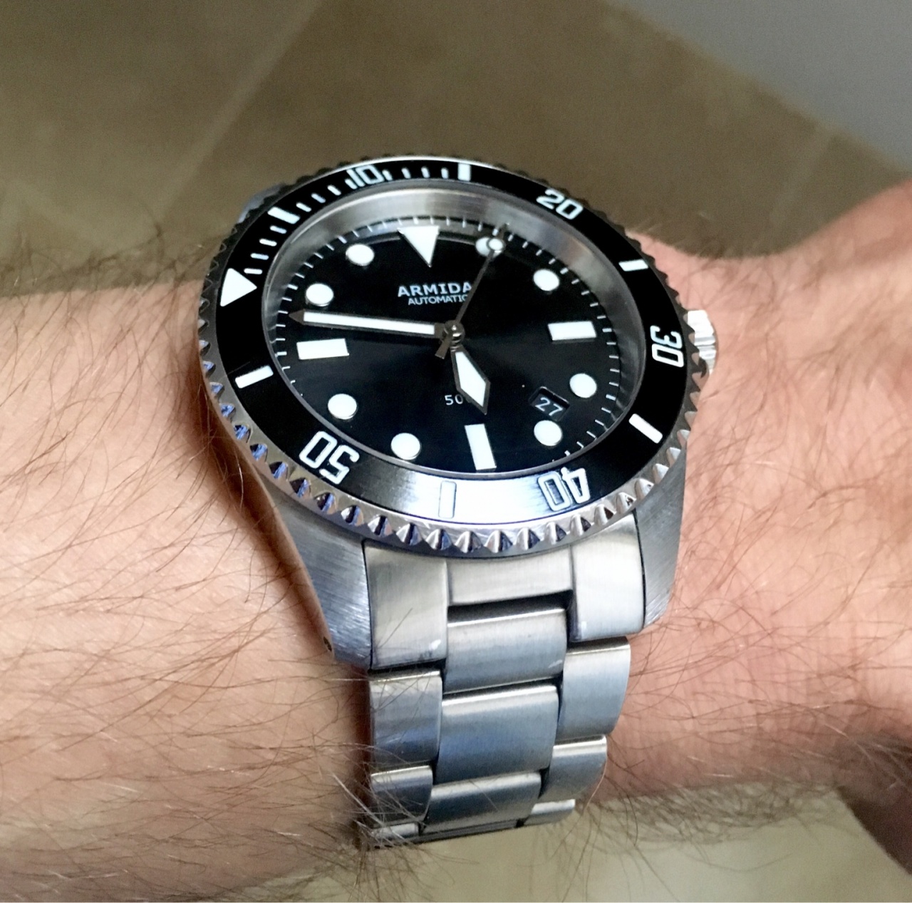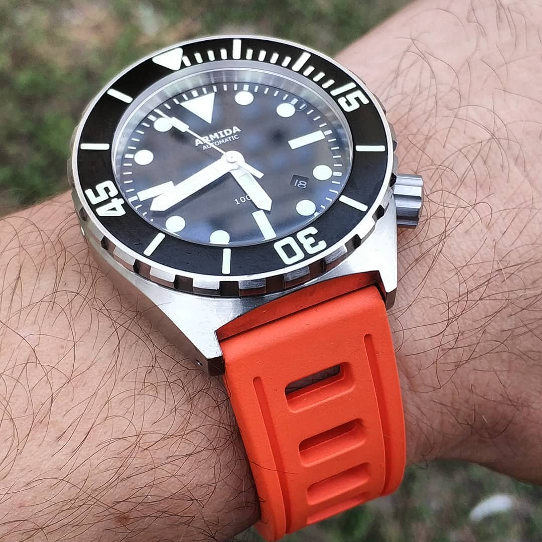 Хочется, чтобы в данной теме владельцы часов марки Armida (или те, кто близко знаком с ними) поделились своим мнением. О самой марке мне сказать особо нечего - это микробренд, базируется в Гон-Конге, специализируется на производстве "дайверов". Я бы поставил их в один ряд с Helson, Zoretto и др.подобными. Начну с себя. В моем обзоре модель Armida A12. Прежде всего отмечу, что данные часы представляют собой хомаж на небезызвестную модель 62mas от Seiko. Я в мире одержимых часами недавно и, скорее, поверхностно, поэтому до недавного времени данные часы мне были не знакомы, и впервые с 62mas я познакомился, увидев хомаж на них от компании MWW. Как-то сразу запали они мне в душу, но купить эти часы не представлялось возможным, поскольку выпуск их был лимитирован и все было раскуплено по предзаказу (позже они появлялись на вторичке, но по завышенным ценам) в конце 2016го года. Чуть позже и сами Seiko вспомнили о своей легенде, выпустив SLA017 по заоблачной цене. Нельзя не упомянуть и о многочисленных китайских "no name" и не только хомажах, но что-то в них меня отталкивало. Armida А12 были представлены в декабре 2017го года и выпускались с тех пор небольшими тиражами (20-25 штук) трижды. В первом издании на выбор предлагались два механизма - Seiko NH35 и ETA 2824 (далее только Seiko). Ко второму выпуску, помимо классической вариации, в линейке появился вариант с синим лицом и безелем, а в комплект был добавлен стальной браслет. В третьем выпуске обновилось стекло (стало лучше просматриваться по краям, "не съедая" метки). А полный комплект данных часов включает в себя часы, резиновый ремешок, стальной браслет, инструмент для шпилек и браслета. Сами часы имеют размер в диаметре 38 мм (без ЗГ), по дужкам 48 мм. ЗГ завинчивающаяся, размер 7 мм, увенчана узором. Стекло сапфировое с антибликовым покрытием, возвышается над корпусом на 3 мм (как в оригинальных Seiko). Толщина корпуса 13.8 мм. Механизм в часах - автомат Seiko NH35. Водозащита 300 м. Ремешок - 20 мм. C3 Superluminova на точке на безеле и метках. Безель, кмк, алюминиевый - производитель о нем не пишет. Метки циферблата накладные. Задняя крышка глухая. Заказывал на сайте производителя - www.armidawatches.com. Цены указаны с доставкой, в Новосибирск ехали чуть больше недели службой EMS. Часами я владею недавно. Впечатления от часов только положительные. Читаемость циферблата отличная, люм шикарный, но пока не замерял сколько часов светят. Размер корпуса для меня идеален (запястье 16.5 см), по дужкам 48 мм тоже отлично сидят и смотрятся - как на браслете, так и с ремешками. Возможно, иногда ЗГ упирается в запястье (очень уж длинная), но не критично. Зато пользоваться ею очень удобно. На застежке браслета имеется функция регулировки размера - можно быстро увеличить на 13 мм (5 шагов по 2.5 мм). С ходом проблем нет - механизм проверенный и надежный. Точность не замерял, но и за две недели ни разу не подводил стрелки. Ложечку дегтя (хотя кому-то она покажется большой ложкой) добавило только крепление браслета, а именно то, что есть небольшой люфт между крепежными звеньями и корпусом, соответственно, иногда слышится легкое побрякивание. И немного дисгармонично выглядит то, что на корпусе сатинирование по кругу, а на браслете вертикально. Интересно мнение форумчан об этих моментах. А в целом, я часами очень доволен. Год ожидания (а именно столько я ждал, когда смогу их приобрести) оправдан. И немного фото напоследок. Есл