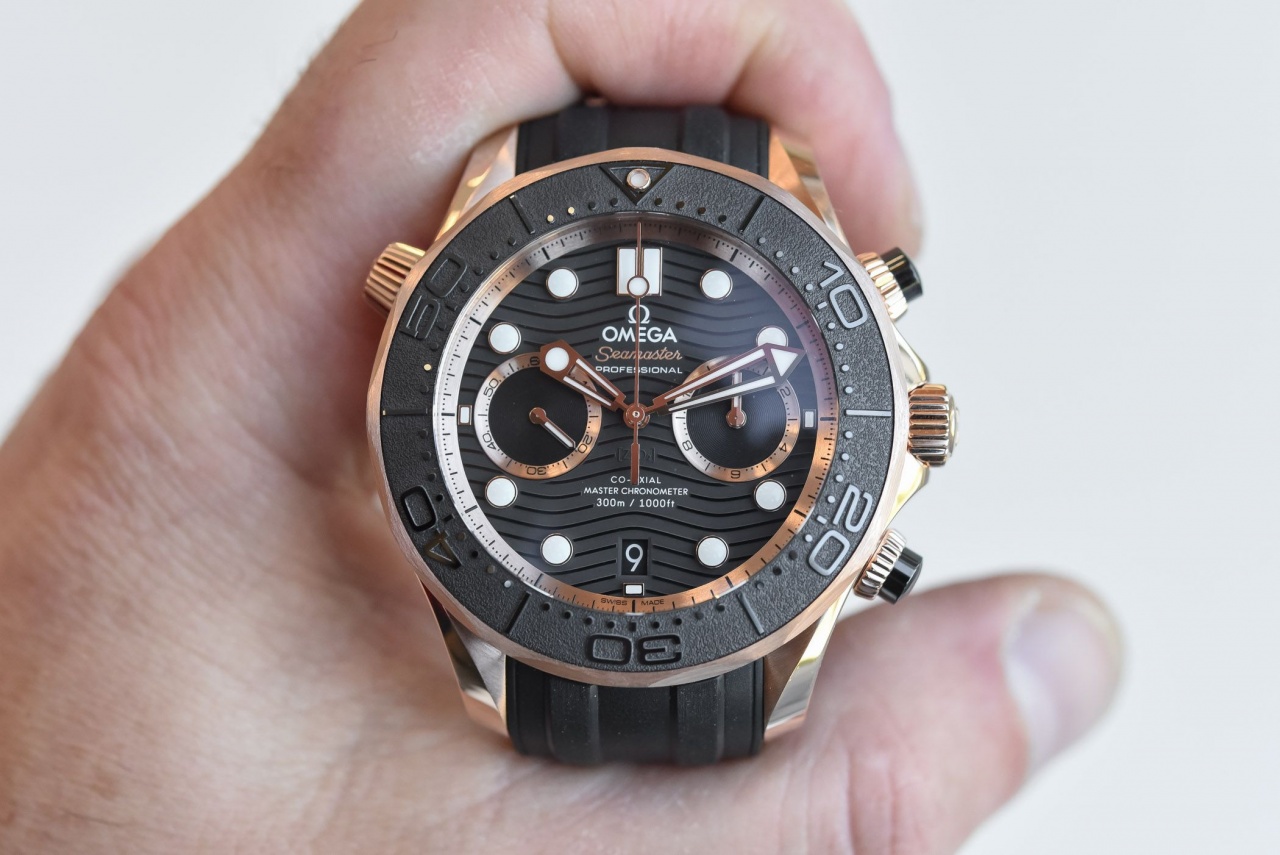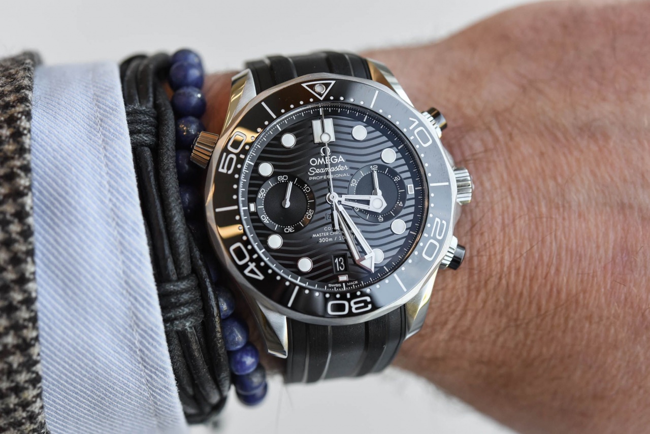 В прошлом году в рамках салона Baselworld 2018 компания Omega представила серию обновленных моделей Seamaster Diver 300M, известных в народе как «часы Джеймса Бонда». Модель получила обновленный корпус, керамический циферблат с лазерной гравировкой, керамический безель со шкалой, нанесенной эмалью, и, главное, мануфактурный механизм категории Master Chronometer. Первый абгрейд уже новой линейки коснулся функционала. В 2019 году модель Seamaster Diver 300M обзавелась хронографом и получила 3 варианта исполнения: сталь, биколор и золото Sedna. Цвет циферблата – черный, синий, серый с синим. Носить часы предлагается на каучуковом ремешке или стальном/биколорном браслете.
