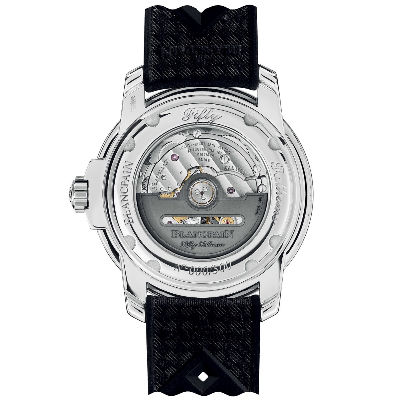 Золотой ротор автоподзавода сопровождает специальный вырез, а его темный цвет приближен как к цвету циферблата с безелем, так и к оттенку каучукового ремешка, тропический стиль исполнения которого является прямой отсылкой к винтажным Fifty Fathoms Barakuda.