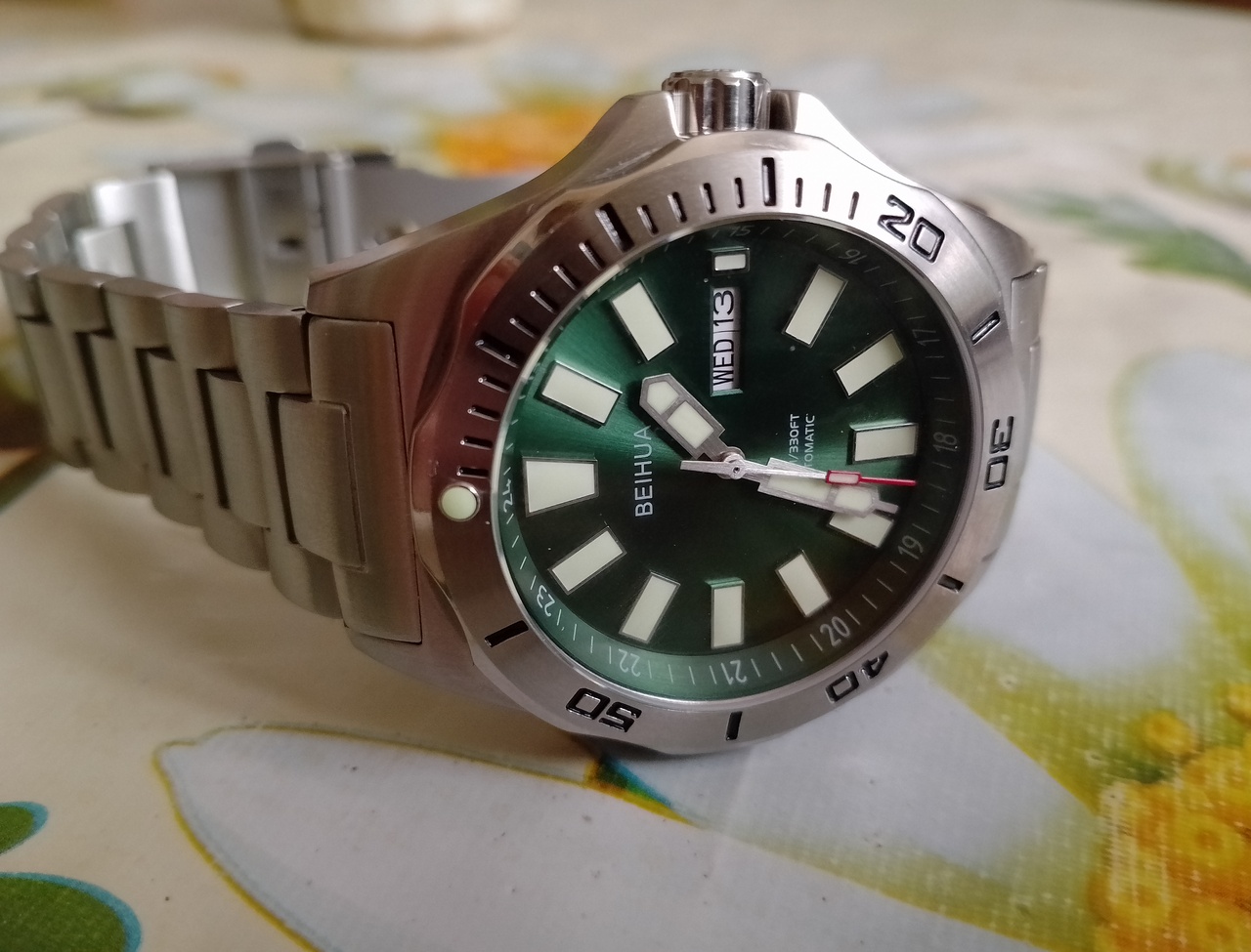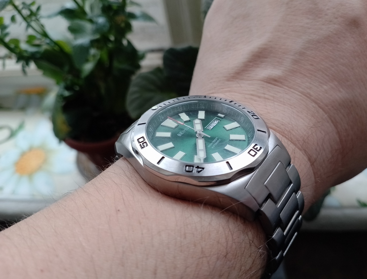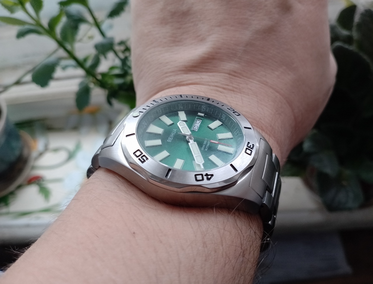 Не знаю в какой ветке хвалятся часами, решил похвалиться в ветке, посвящённой часам YELANG, чтобы не создавать новую тему, потому как мои новые часы изготовлены, на сколько я понял, именно этим брендом. Часы называются BEIHUA, нашёл я их среди YELANG-гов, были разные модели эдаких военных часов с тритием и т.д... типа милитари... и среди них были часы в корпусе YELANG, с логотипом на коронке YELANG (волк), но названием BEIHUA. Вначале, думал взять YELANG с тритием и с арабскими цифрами, но в варианте с тритием не было никакого люма, а мне хотелось большие широкие метки, а не только маленькие тритиевые колбочки, и тут я увидел вот эти часы, в корпусе YELANG, но с цифером с люмом с полной датой, часы ни на кого не похожие, не хомаж ни на что, я как раз искал такие элегантные дайверы, типа, аля дайверы, но чтобы выглядели красиво и не слишком котлообразно. Часы, как по мне, имеют свой дизайн, ни на что особо не похожий, хоть и простые, но огромного размера метки с суперлюминовой, полная дата, огромные стрелки с суперлюминовой (всё это дело светится всю ночь), заводная головка на резьбе, также, как и задняя крышка (которая, к слову сказать - ещё и прозрачная, через неё видно механизм SEIKO NH36A). Отделка часов просто превосходная, я не нашёл к чему придраться, все очень мягко сатинировано, полированная полоска лишь по торцу безеля - всё остальное - сатинирование. Лишь края корпуса с внутренней стороны немного островаты, но дискомфорта руке не создают. На руку садятся как влитые. Не смотря, что часы имеют диаметр 43 по безелю и 34 по циферблату (считай, обычный , средний размер) смотрятся, как огромные котлы... вероятно, за счёт того, что сам циферблат очень большой по соотношению к корпусу. Цифреблат имеет цвет малахит с эффектом "солнечные лучи". Безель одностороннего вращения с небольшим люфтом, работает и ладно. Общее исполнение часов превосходное!!! А, да, забыл! - стекло, конечно, сапфир!! Не думал, что за 9932 руб. можно получить такую красоту. Браслет комплектный большой длины на большую руку, снял сразу три звена и чуть подстроил пряжку под своё запястье, часы сели отлично. Да, пряжка - обычная штамповочка и бакля и сама клипса - и это хорошо!!!!! У моих, например, сейко Монстров (Хомаж от ХеимДаллр) литая клипса режет руку. Штамповка тонкая, лёгкая и приятная для руки, как по мне. На эти часы я давно положил глаз, у наших братьев китайцев они стояли около 19 000 руб... я терпеливо ждал скидки и акции и дождавшись акции и дополнительно использовав купоны и баллы, цена вышла в 9932 руб. Как по мне - так супер.. Итак, фото.... Вложение 3648772 Вложение 3648773 Вложение 3648774 Вложение 3648775 Вложение 3648776 Вложение 3648777 Вложение 3648778 Вложение 3648779 Вложение 3648780 Вложение 3648781 Вложение 3648782 Вложение 3648783 Вложение 3648784 Вложение 3648785 Вложение 3648786 Вложение 3648787 Вложение 3648788 Вложение 3648789 Вложение 3648790 Вложение 3648791 Вложение 3648792 Вложение 3648793 Вложение 3648794 Долго искал элегантные дайверы (или почти дайверы 10 АТМ) с абсолютной читаемостью в темноте и с уникальным дизайном - не хомажем, и, похоже, нашёл. |