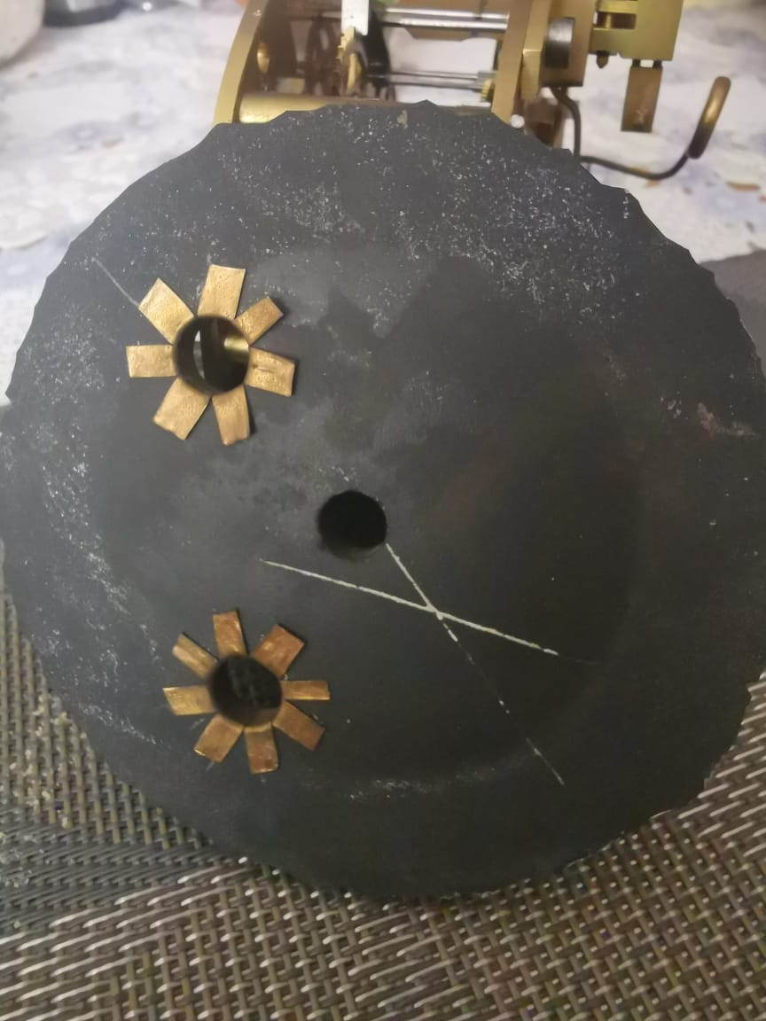 Как-то несколько лет назад на аукционе купил по дешевке каминные часы в деревянном корпусе, который внешне был выполнен под чёрный камень (бельгийский?) и мрамор. Продавались они в таком виде: Вложение 2983167 Приехали они ко мне в виде рассыпавшемся, но ничего страшного, просто корпус весь расклеился. Я его склеил-собрал, воткнул механизм (ничего с ним не делал), запустил - и они у меня ходили года три (заводил раз в 2 недели). Ну тут напомнили о себе - встали. Механизм перебрал, промыл, смазал, и вот обратил внимание на маркировки на платинах механизма, маятнике, циферблате. Может это всё давно знакомо профессионалам, однако, для меня было интересно наблюдать совпадения некие. Вложение 2983168 Вложение 2983169 Вложение 2983170 Вложение 2983171 Вложение 2983172 Вложение 2983173 Номер 65623 выбит на задней платине под клеймом фирмы. Он же написан от руки на тыльной стороне циферблата чёрной краской. Здесь же мы видим выше цифры 23, которые выбиты на передней платине. На линзе маятника номер 65623. А на внутренней стороне дверцы пометки карандашом не совпадающие с номером. |