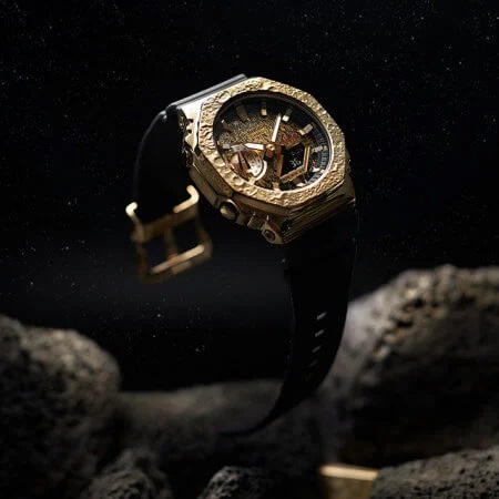 GM-2100MG-1A имеет безель с ионно-золотым покрытием и лунной поверхностью. Циферблат также напоминает луну, а часы имеют уникальную лунную заднюю крышку с золотым IP
