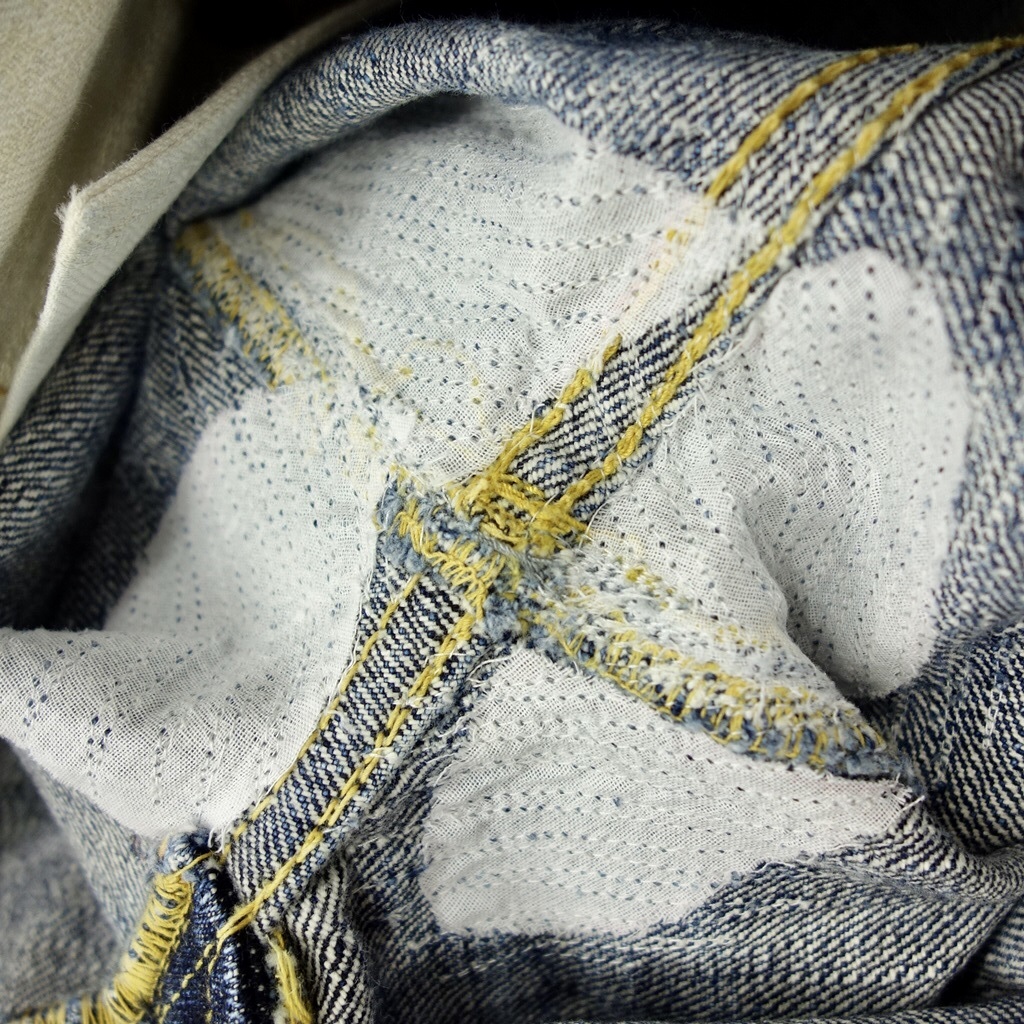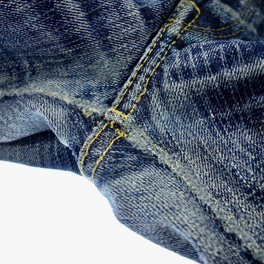 Талия ________ 91/90 Хипс _________ 64/65 Бедро ________ 36,5/36,5 Колено _______ 26/26,5 Лег __________ 23,5/24 Инсим ________ 92/96 Посадка/п _____ 31/31 Посадка/з ______43/42,5 Кроме инсима я бы сказал один размер. В очередной раз убедился, что японцы такие же люди, и так же могут ошибаться, видать бирочку перепутали :). Деним на первый взгляд классический, ровненький, без всяких слабби и непрорядок, но рубчик конечно довольно крупный, нитки толстые по сравнению с 14-17 унцовыми денимами. По виду на 25 унций вроде не тянет. По сравнению с Cho-Kiwami собран более плотно и более гладкий и ровный. Цитата: